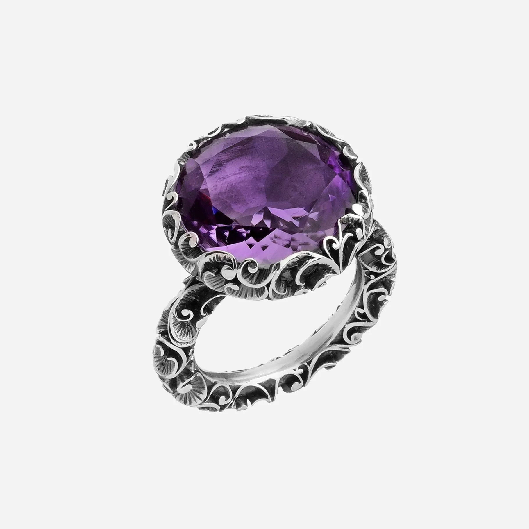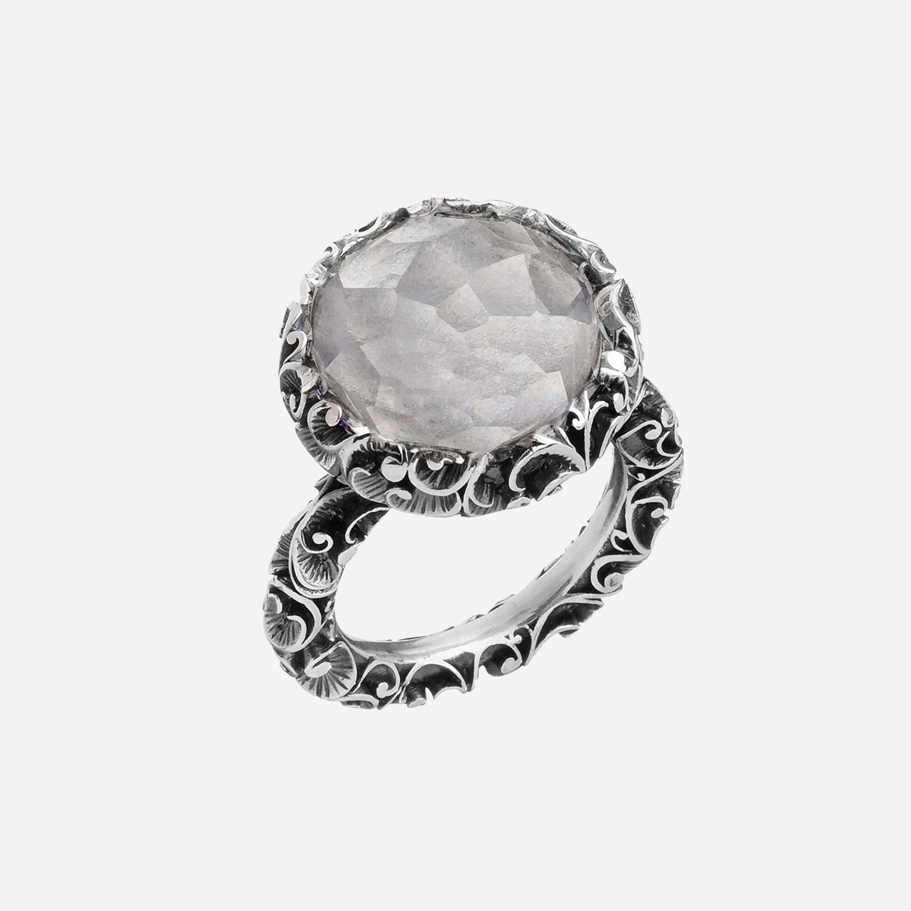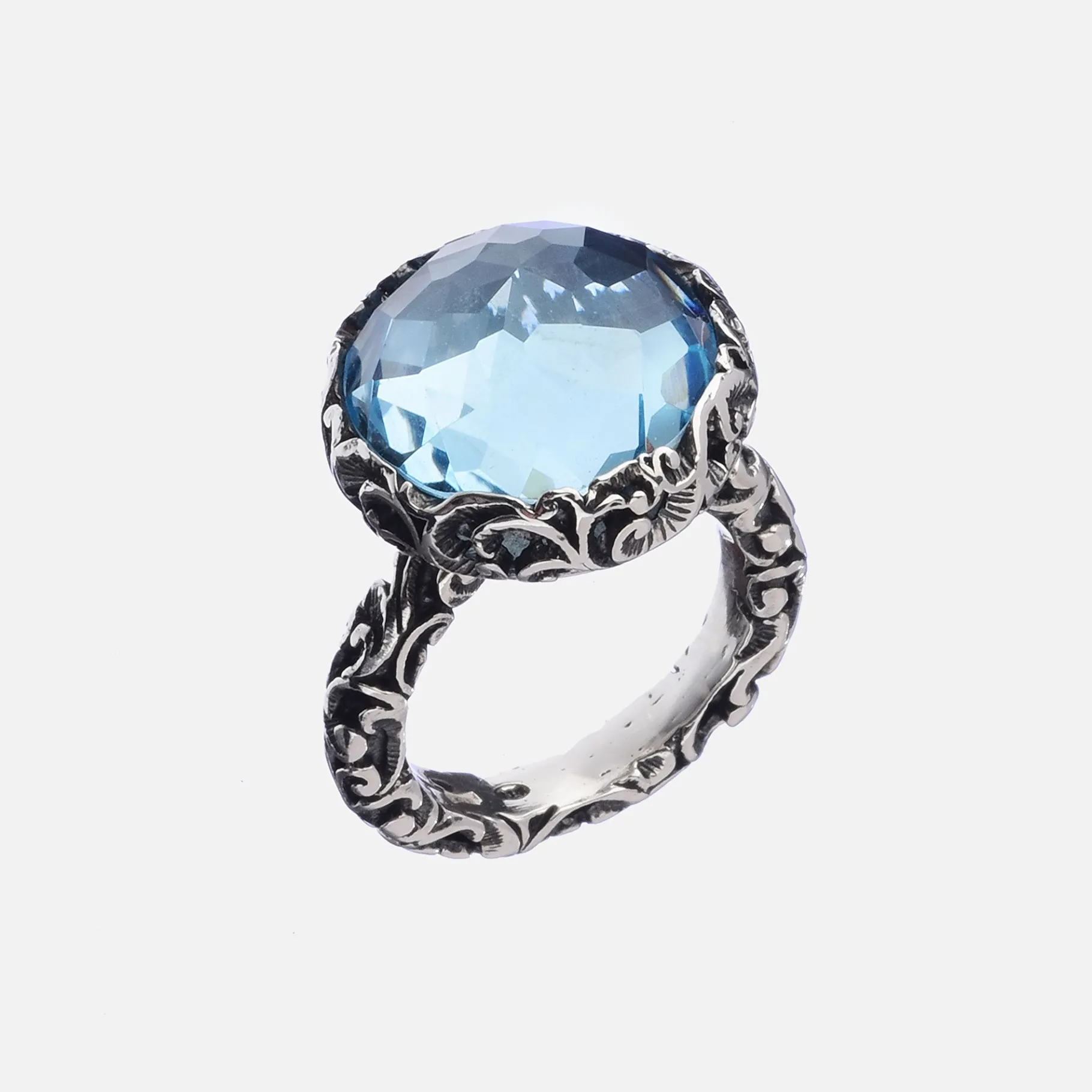 Questo anello a gambo sottile in argento intagliato è impreziosito dalla tonda cabochon taglio sfaccettato che dona al gioiello una luce unica. Sceglilo nel colore che più ami.