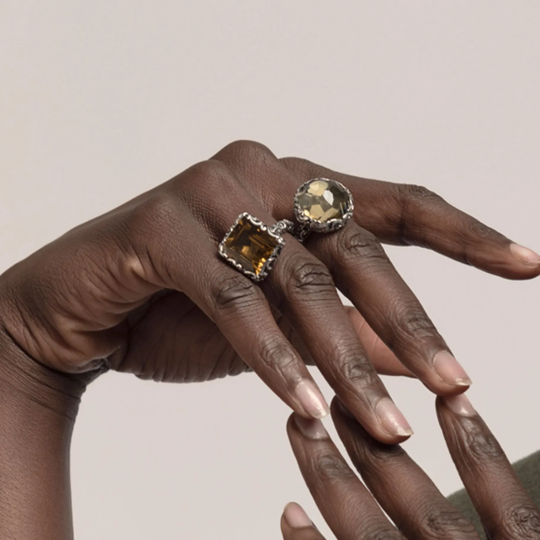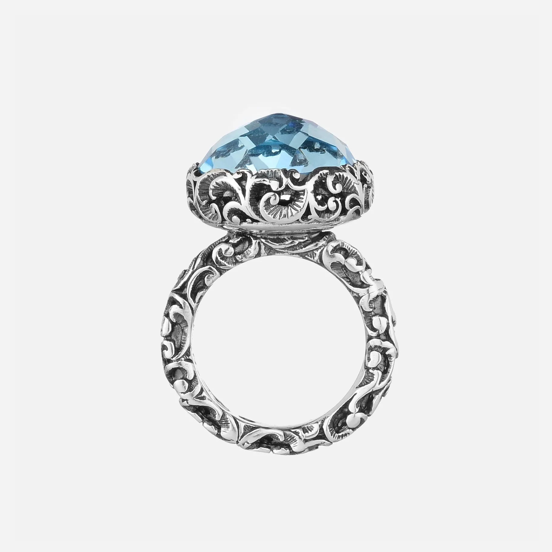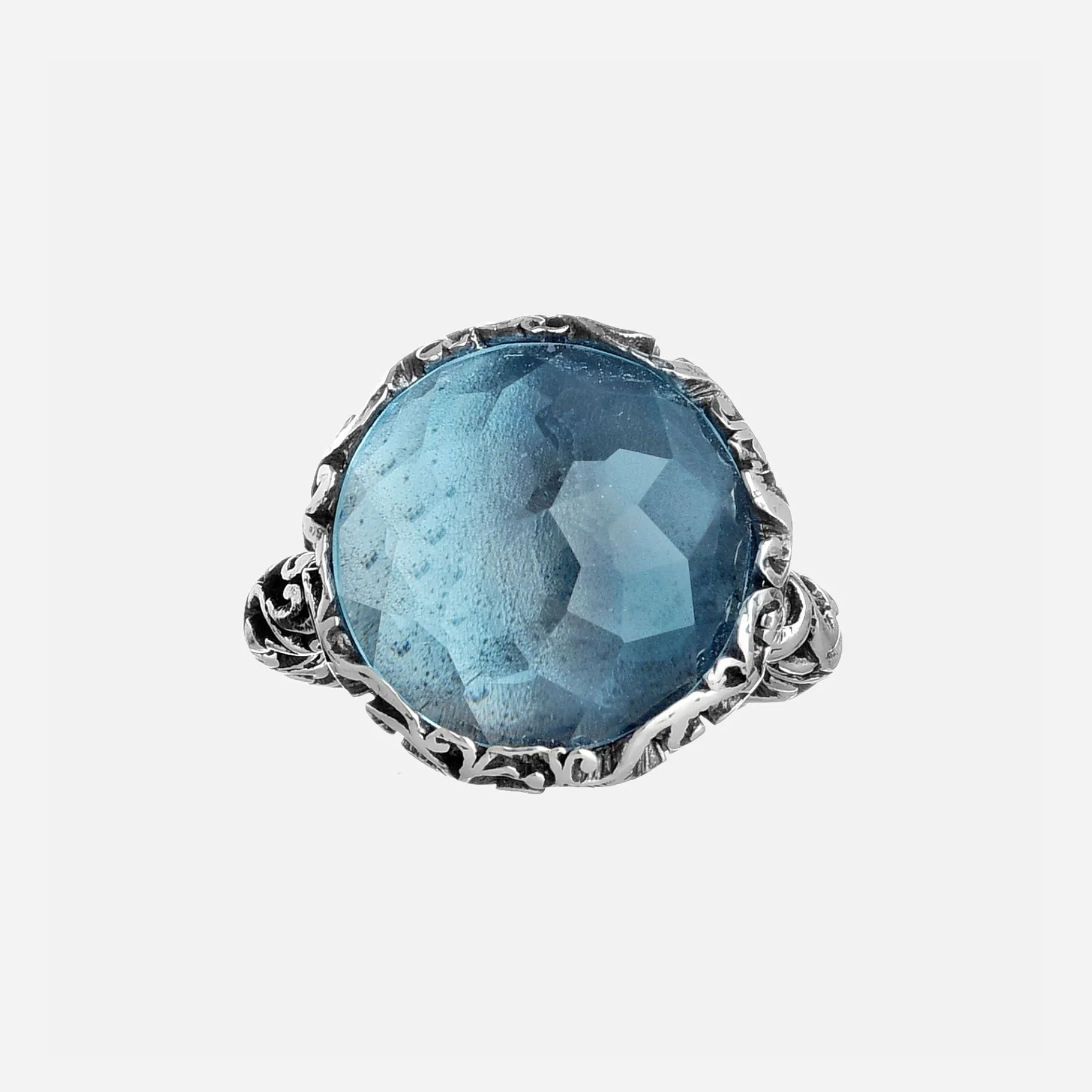 Questo anello a gambo sottile in argento intagliato è impreziosito dalla tonda cabochon taglio sfaccettato che dona al gioiello una luce unica. Sceglilo nel colore che più ami.