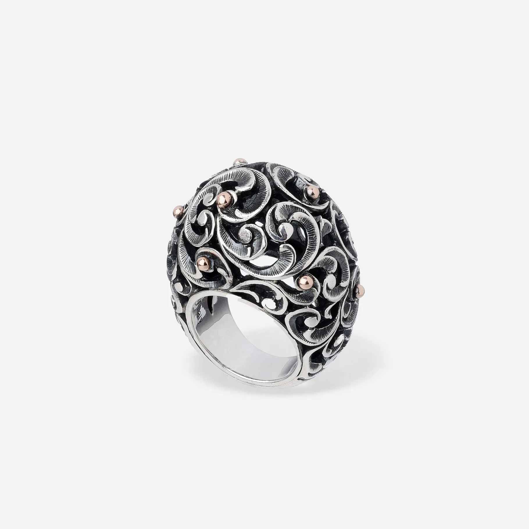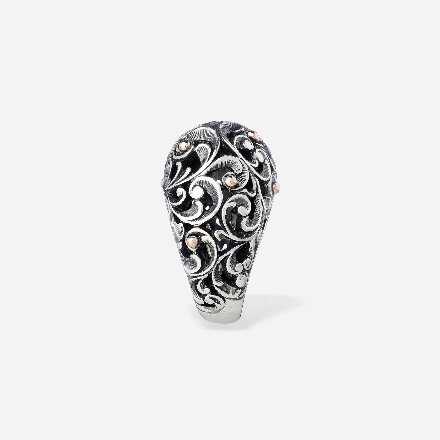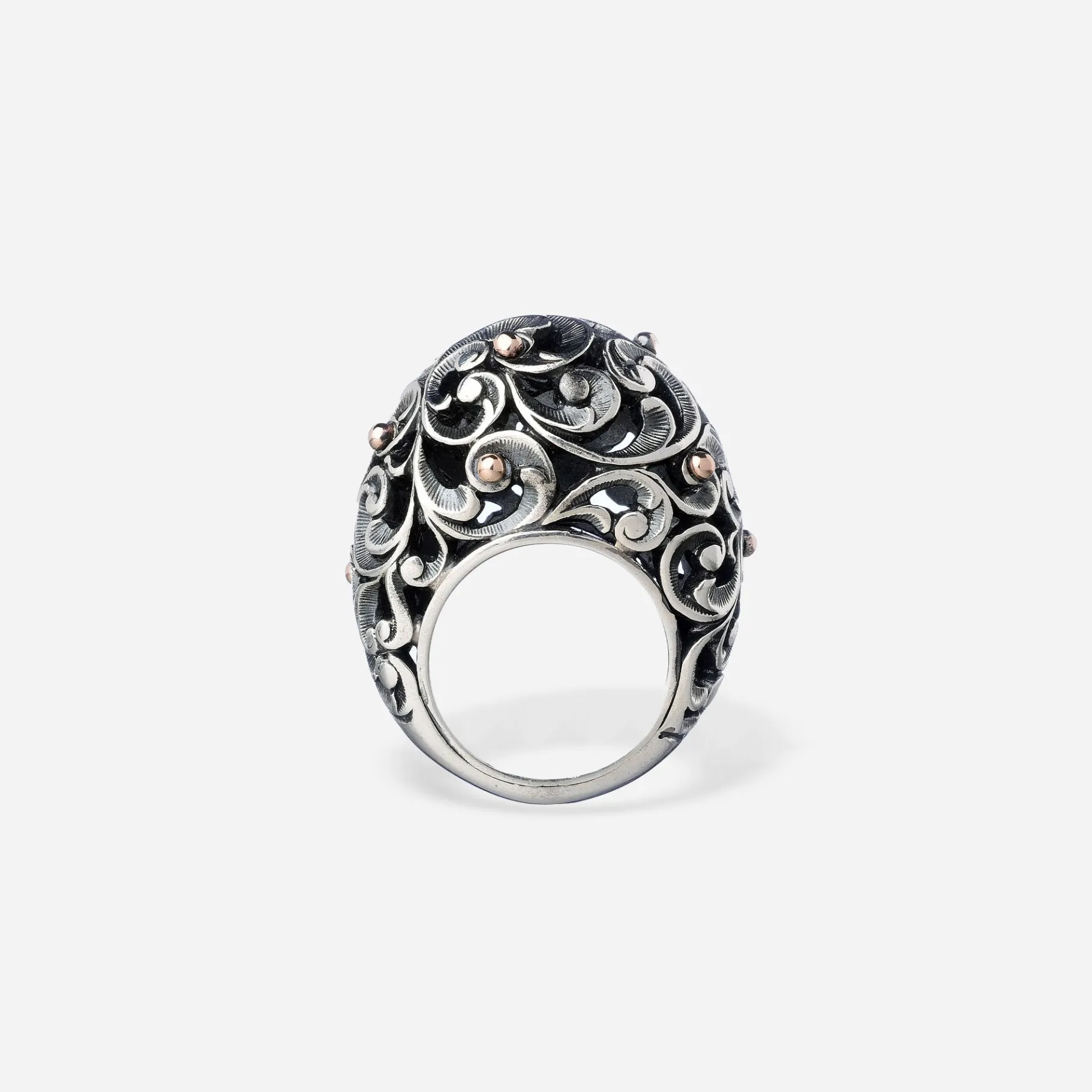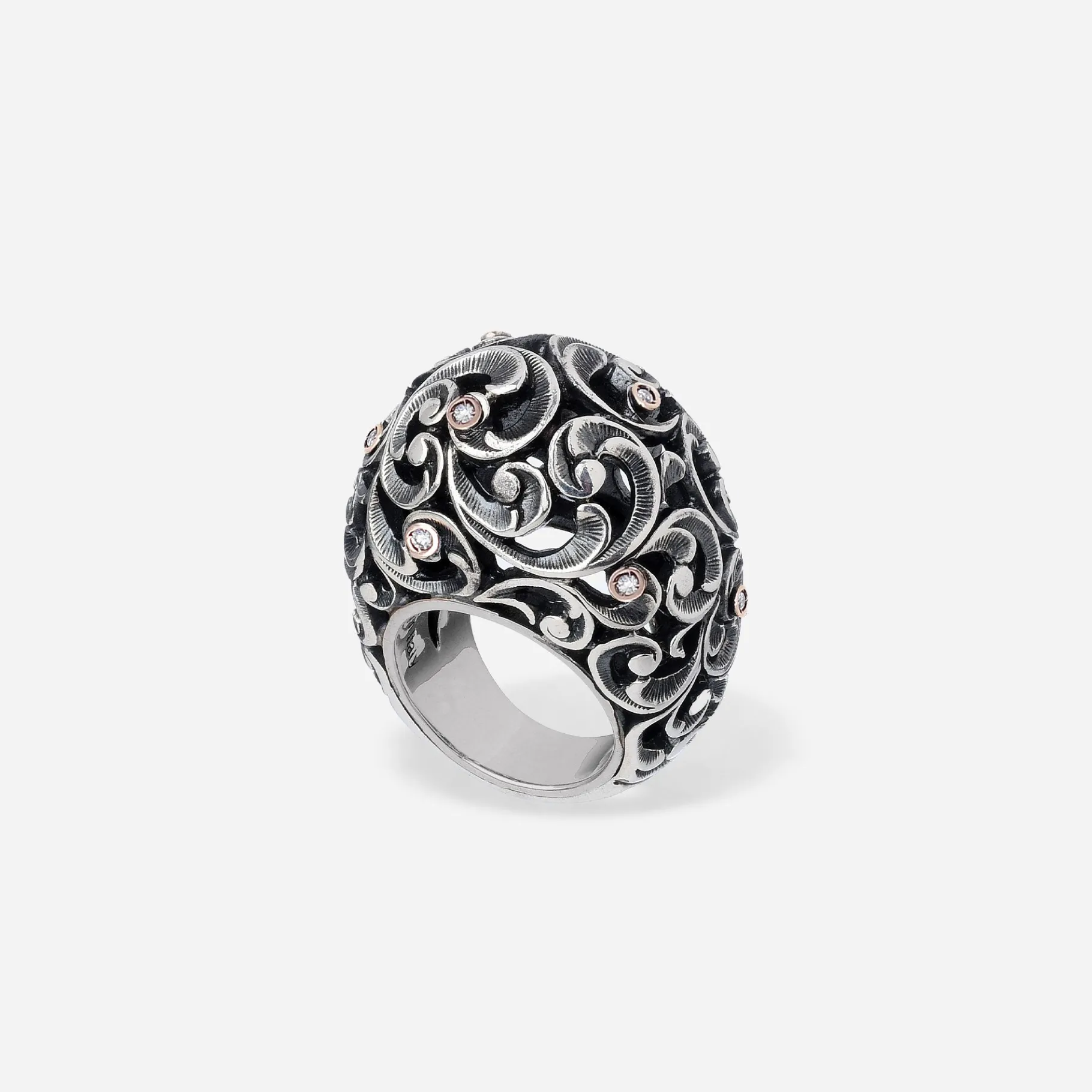 L’anello cabochon in argento traforato è un must have della maison. Qui impreziosito da borchie d’oro 9kt o da Diamanti Brown incastonati in oro 9kt.