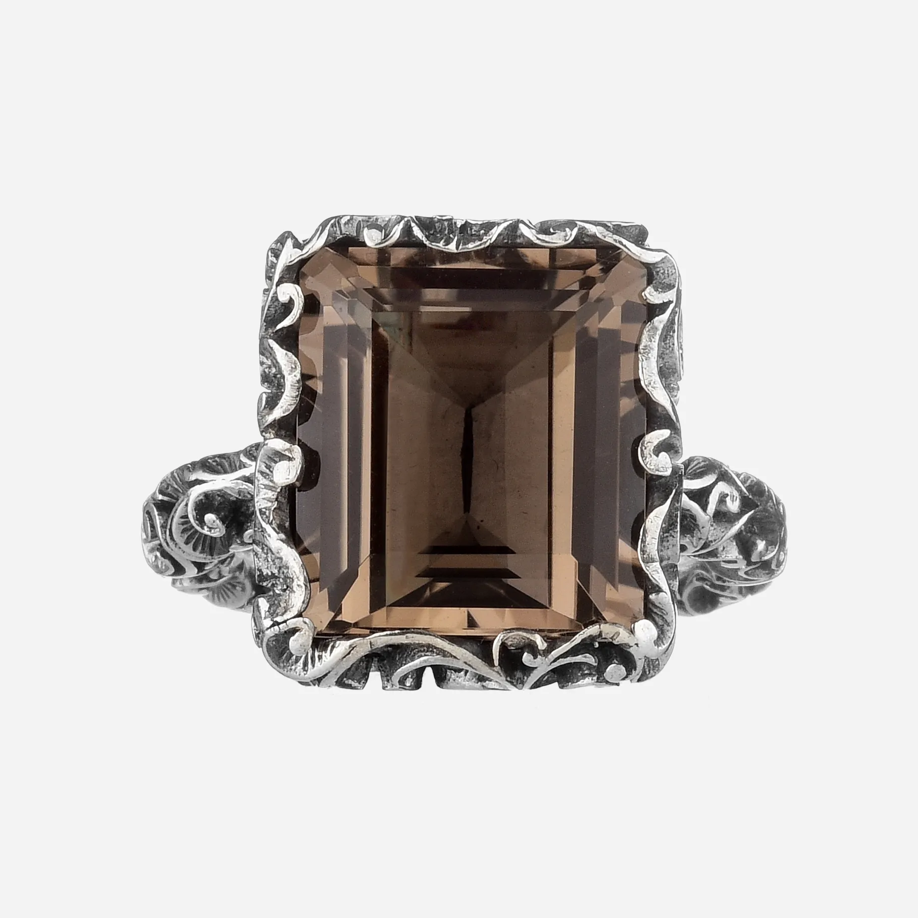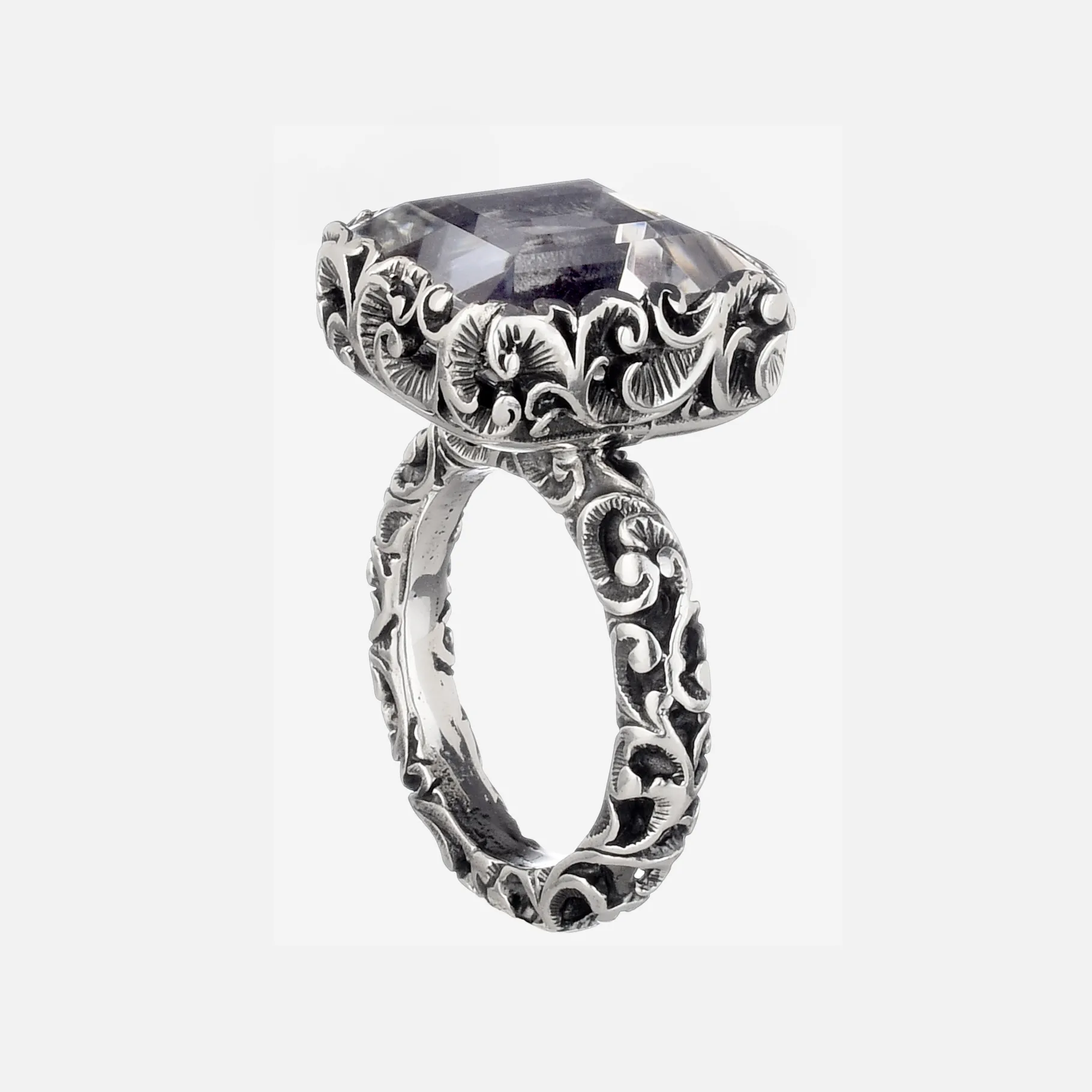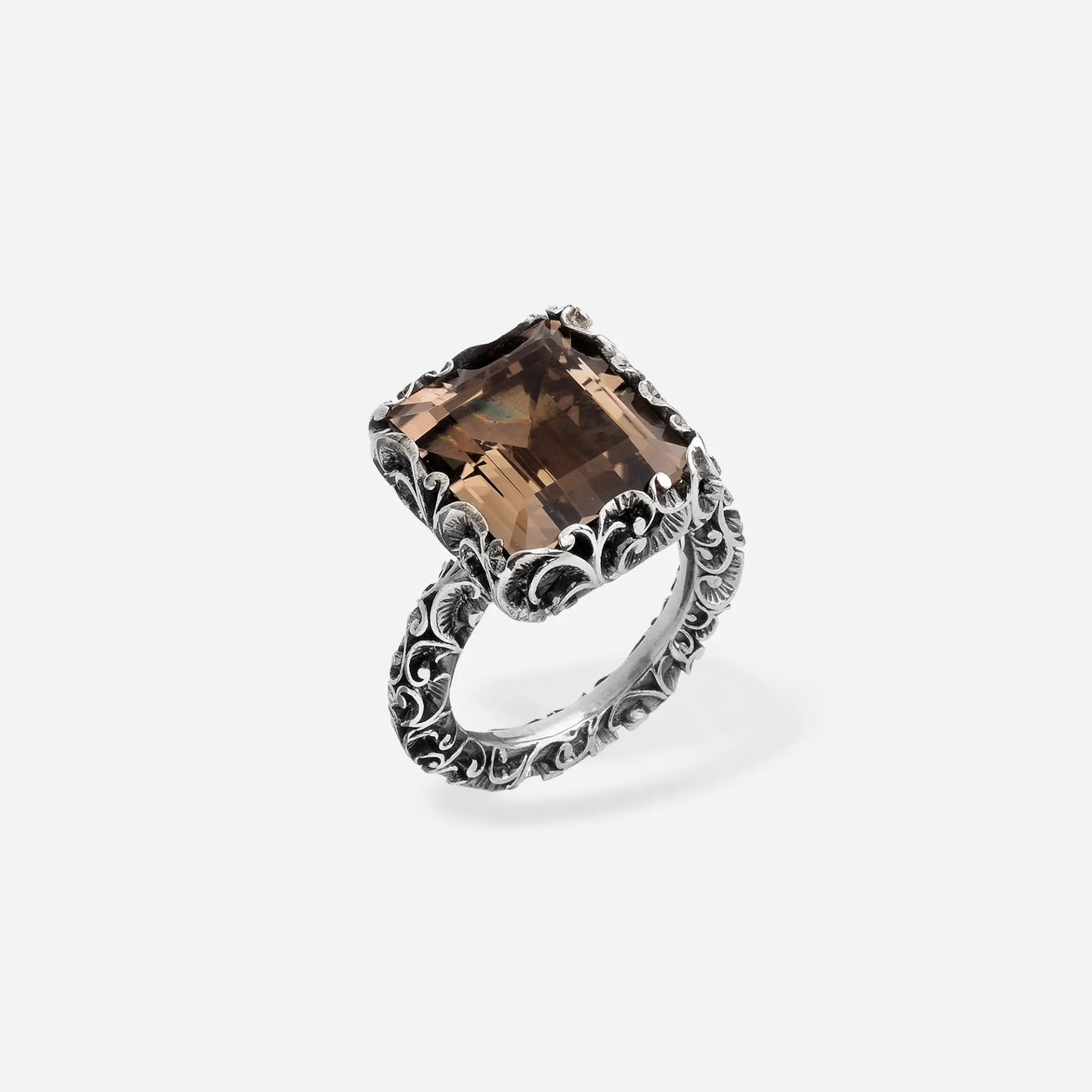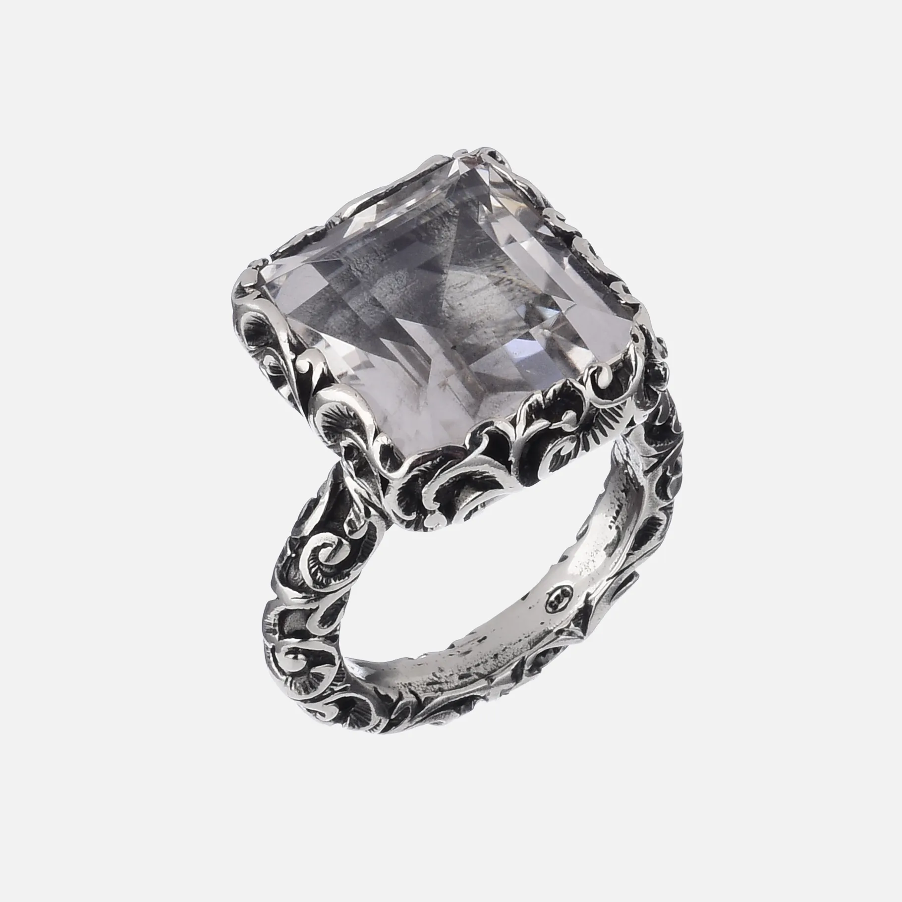 Questo anello solitario in argento brunito si distingue grazie alla pietra rettangolare dal taglio smeraldo che gli conferisce un design unico e inimitabile.