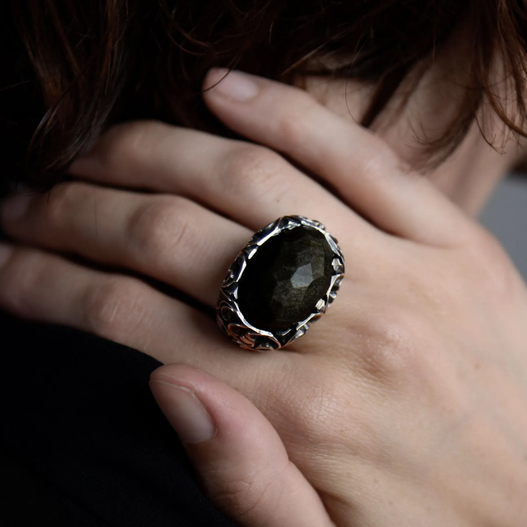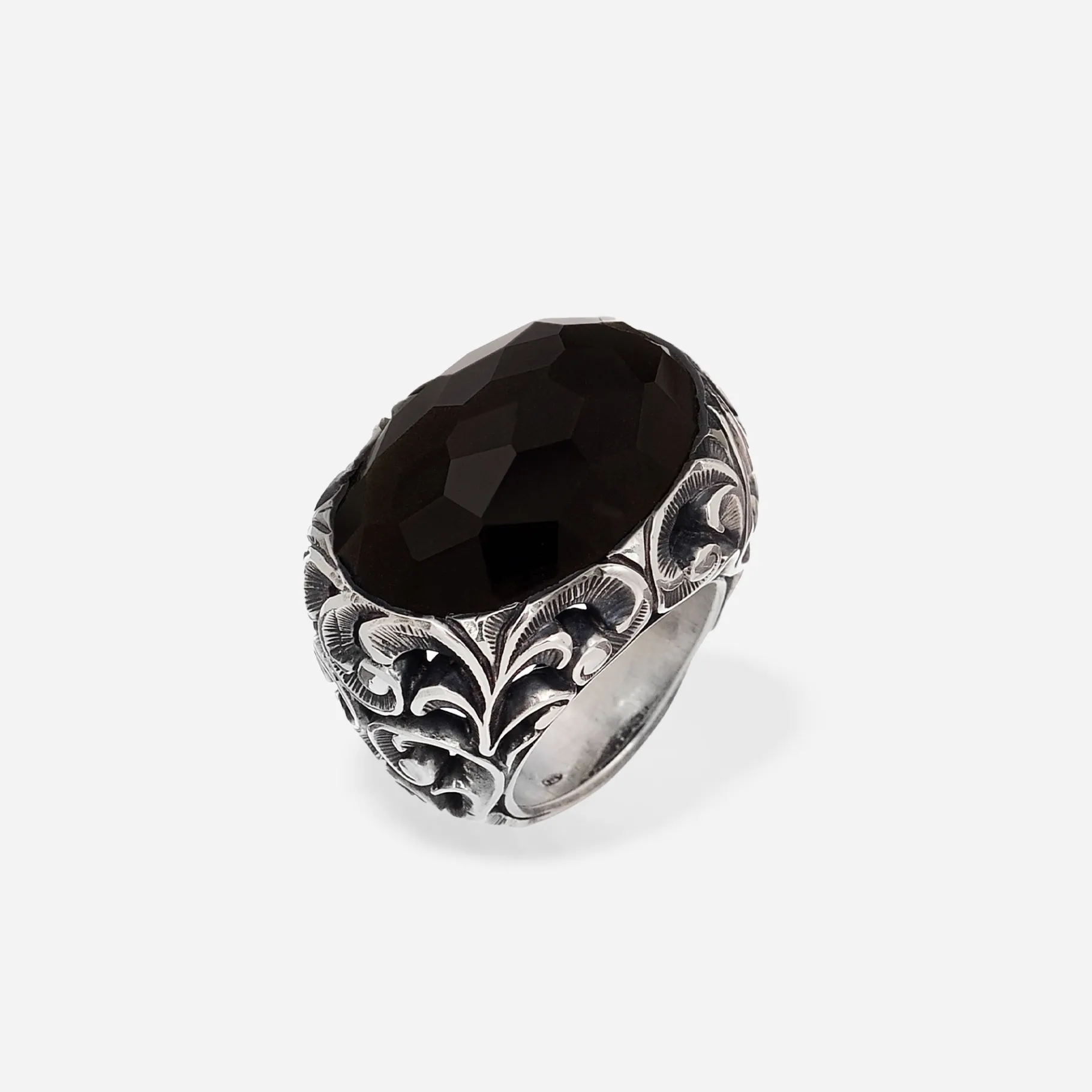 Anello in argento con pietra cabochon sfaccettata in onice nero lucido. Un anello magnetico da indossare come compagno di stile.
