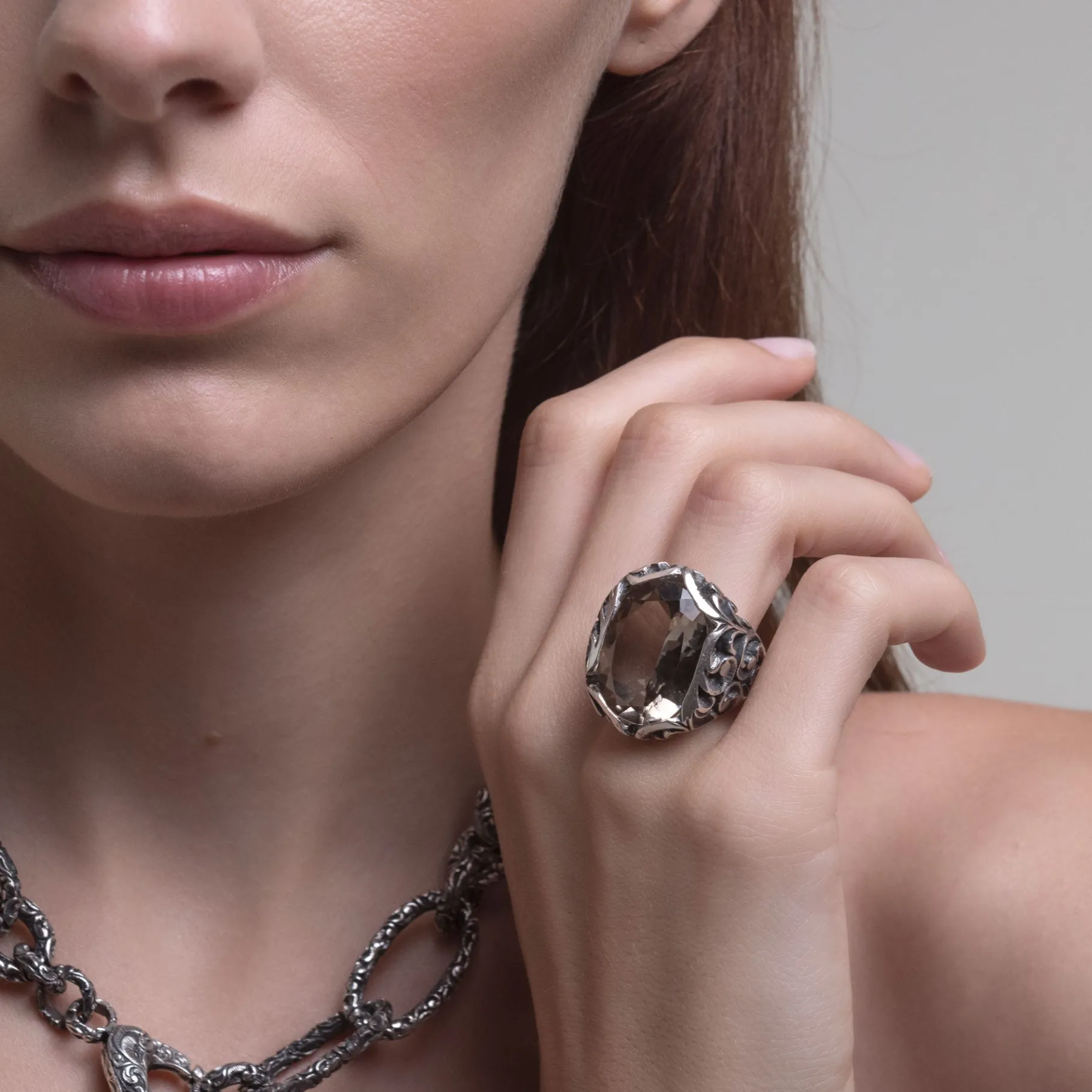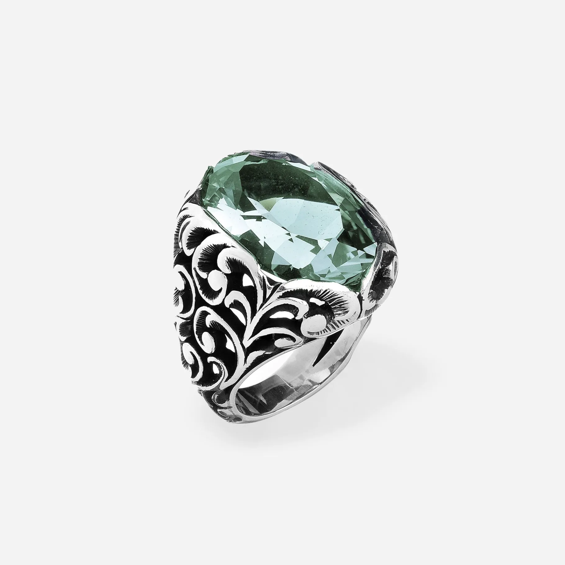 Ovale, grande, quasi sfacciato. Questo anello firmato Maria e Luisa Jewels è un azzardo per tutte quelle donne che vogliono osare senza sensi di colpa. La pietra dona un tocco di colore all’anello in argento brunito, firma unica ed inequivocabile del brand.