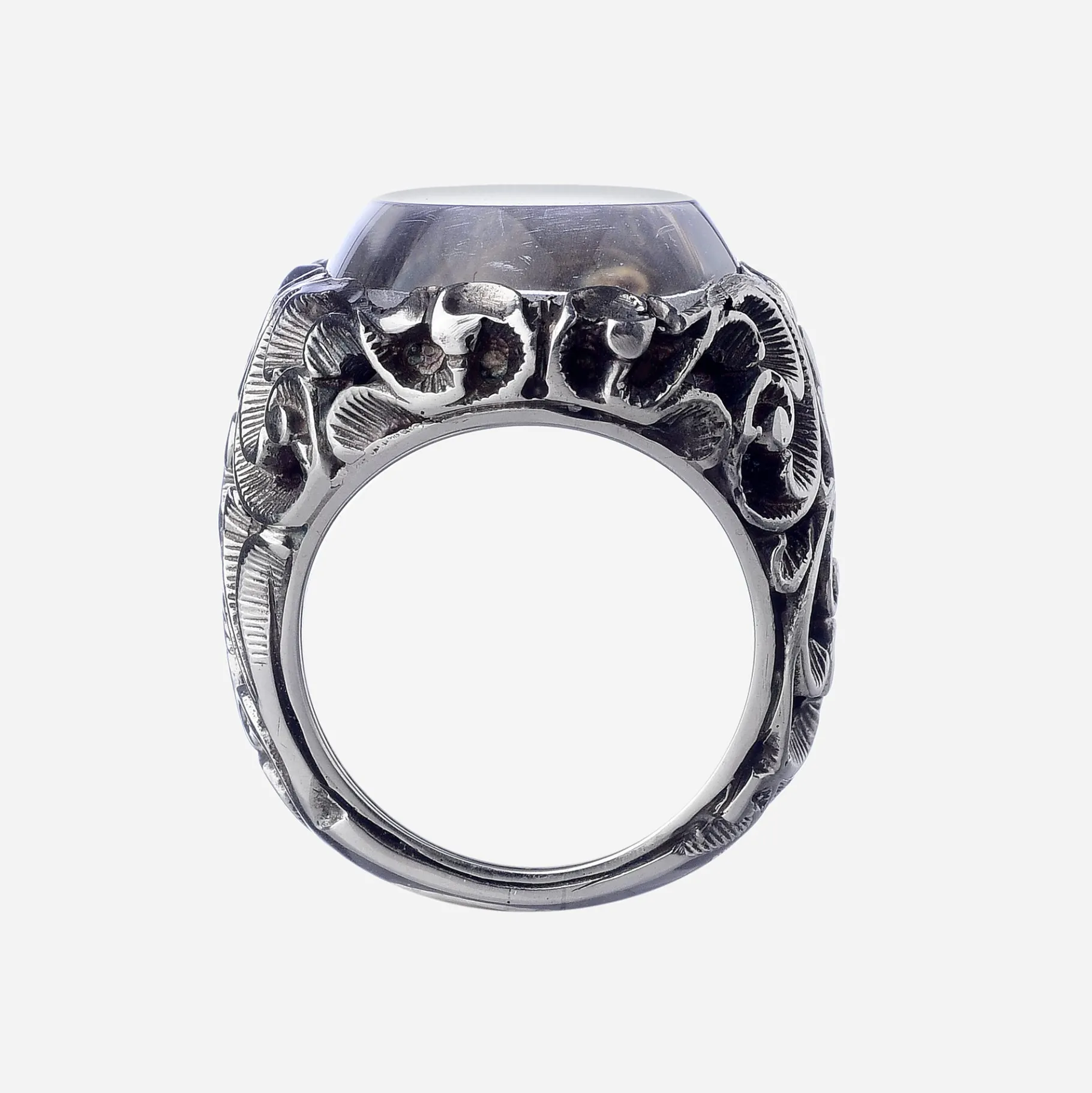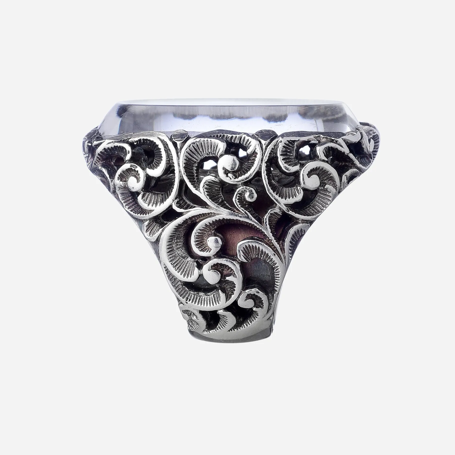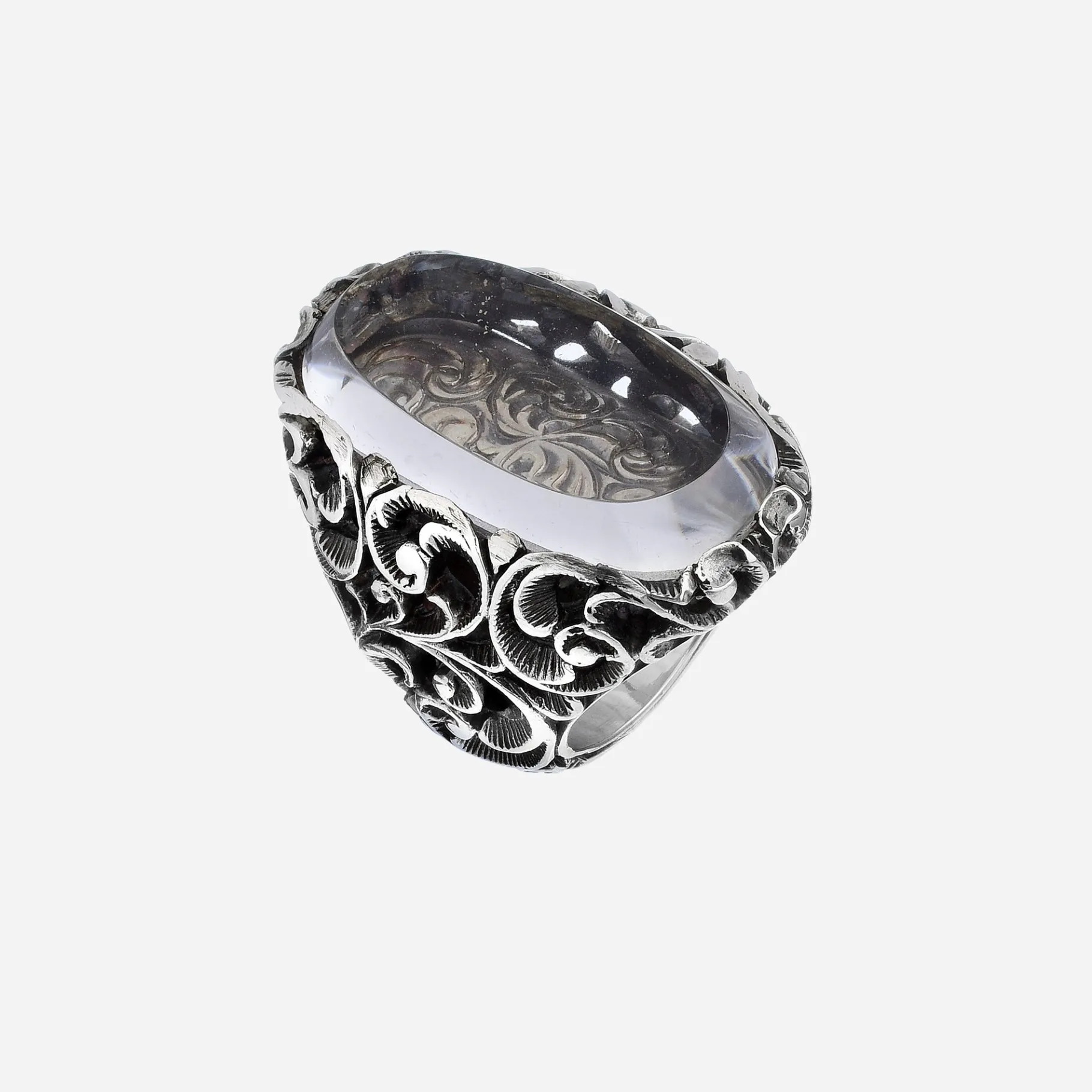 Eleganza e classe unite in un anello importante. In questo anello la pietra centrale ovale dal taglio piatto in Cristallo di Rocca permette di ammirare l’intarsio della piastra damascata alla base del castone in argento. Un accessorio protagonista da indossare per far brillare la tua luce.