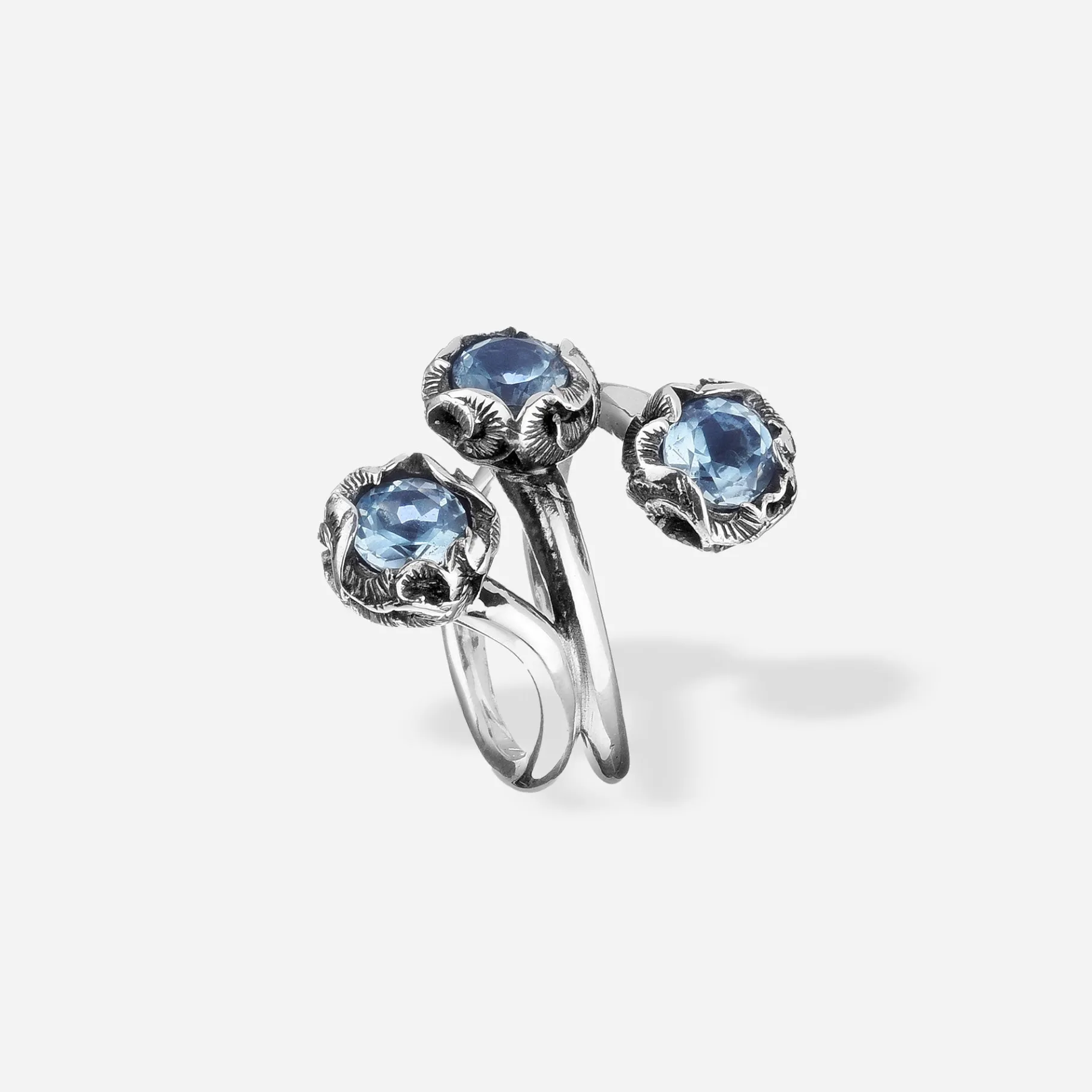 Anello Shri con 3 pietre tonde in Topazio Azzurro naturale e gambo intrecciato lucido. Un gioiello perfetto per dare un accento di luce alle tue giornate.