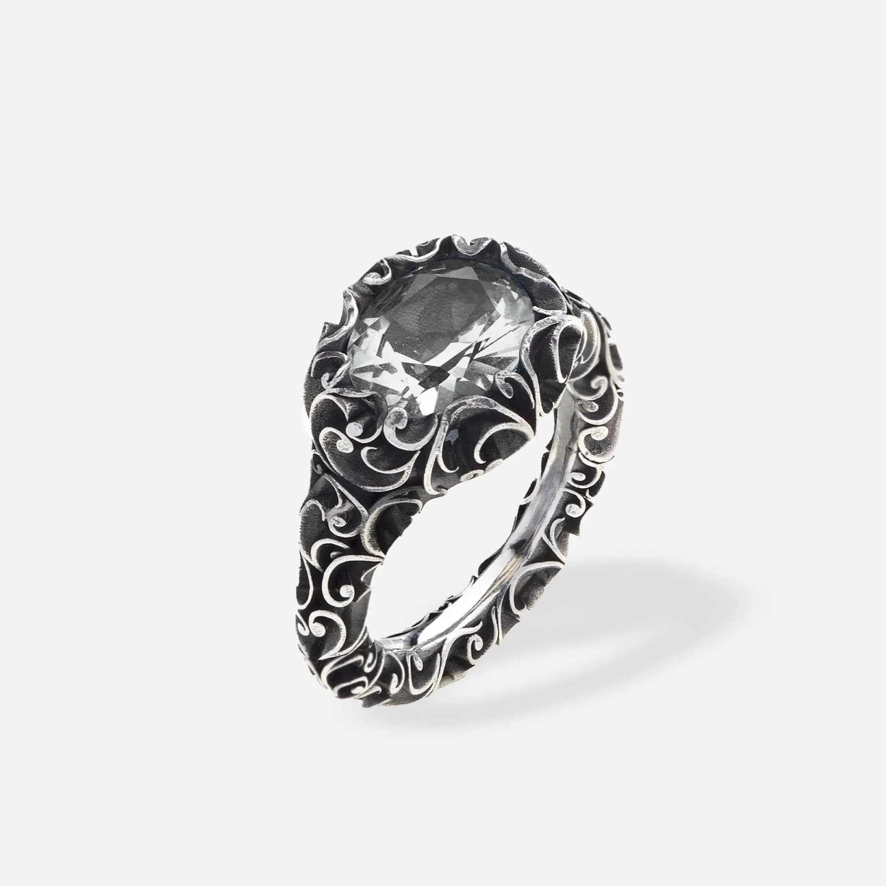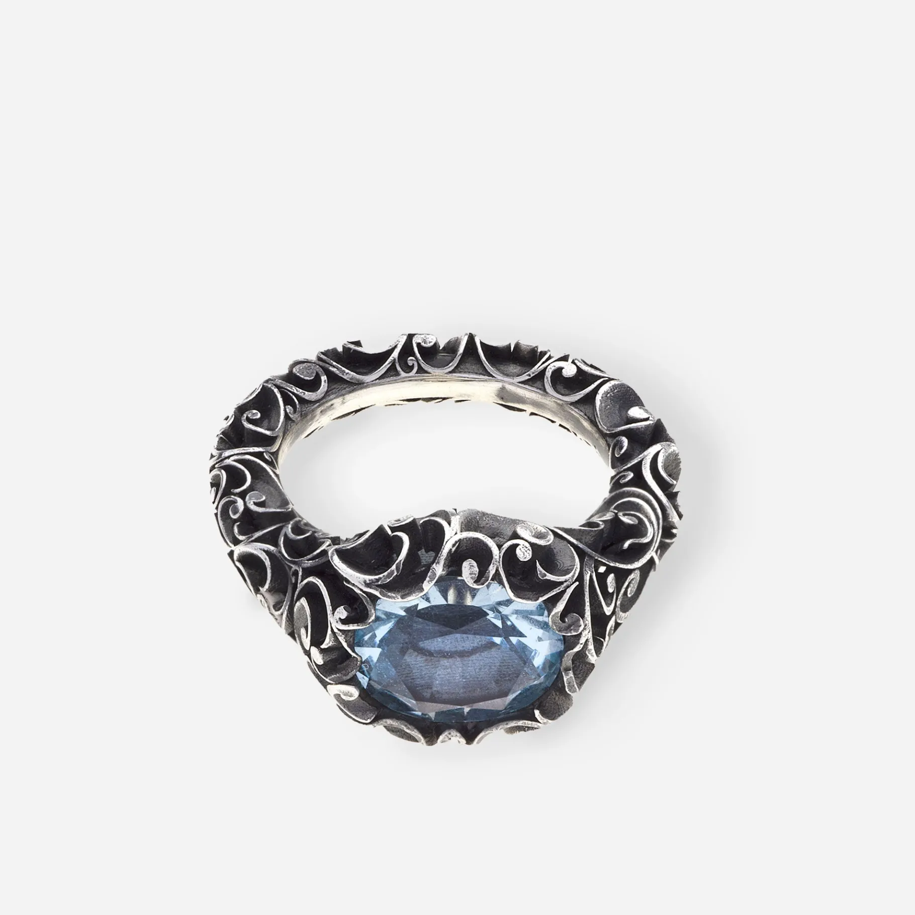 Questo anello della capsule Gioiosa è una dichiarazione di stile e carattere. Realizzato in argento brunito inciso a mano con gambo intarsiato e damascato e una pietra naturale ovale che illumina la fede.