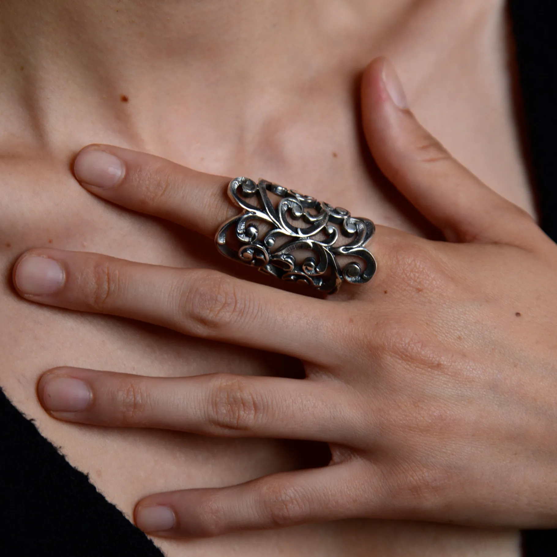 L’anello da falange in argento brunito inciso evoca il gusto di mondi lontani. Questo anello è un’accattivante creazione dallo stile non convenzionale. Per una donna che ama indossare gioielli dalla briosa e irriverente eleganza.