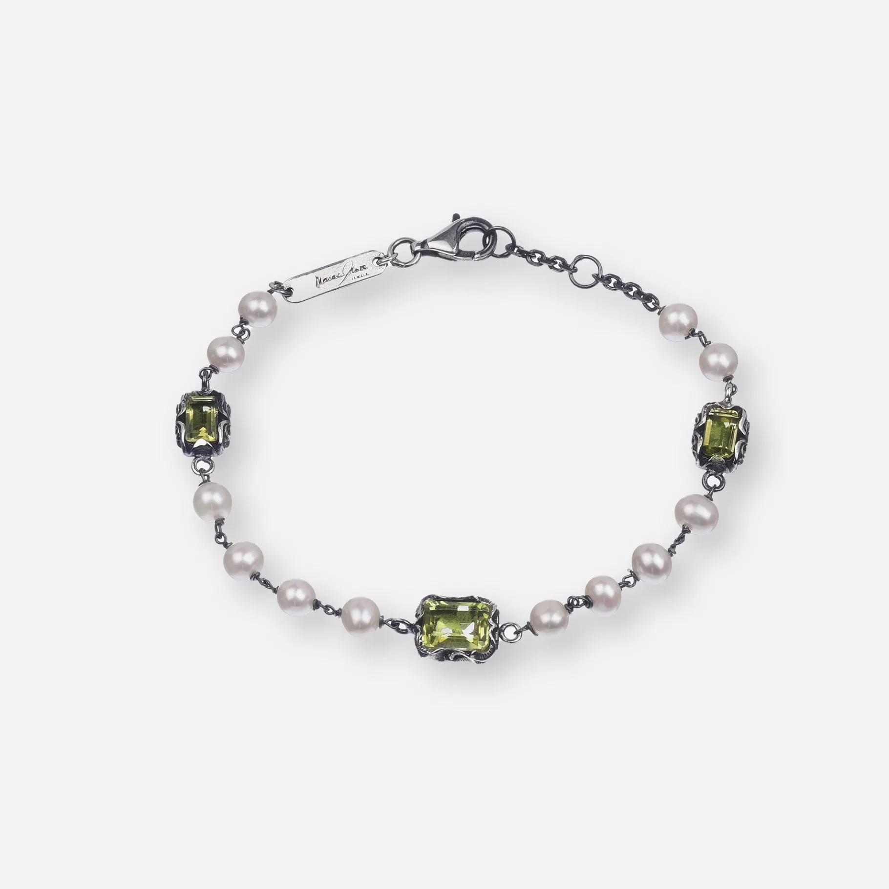 Bracciale in argento con 12 perle alternate a 3 pietre dal taglio smeraldo in Peridot, pietra naturale dal colore verde brillante.