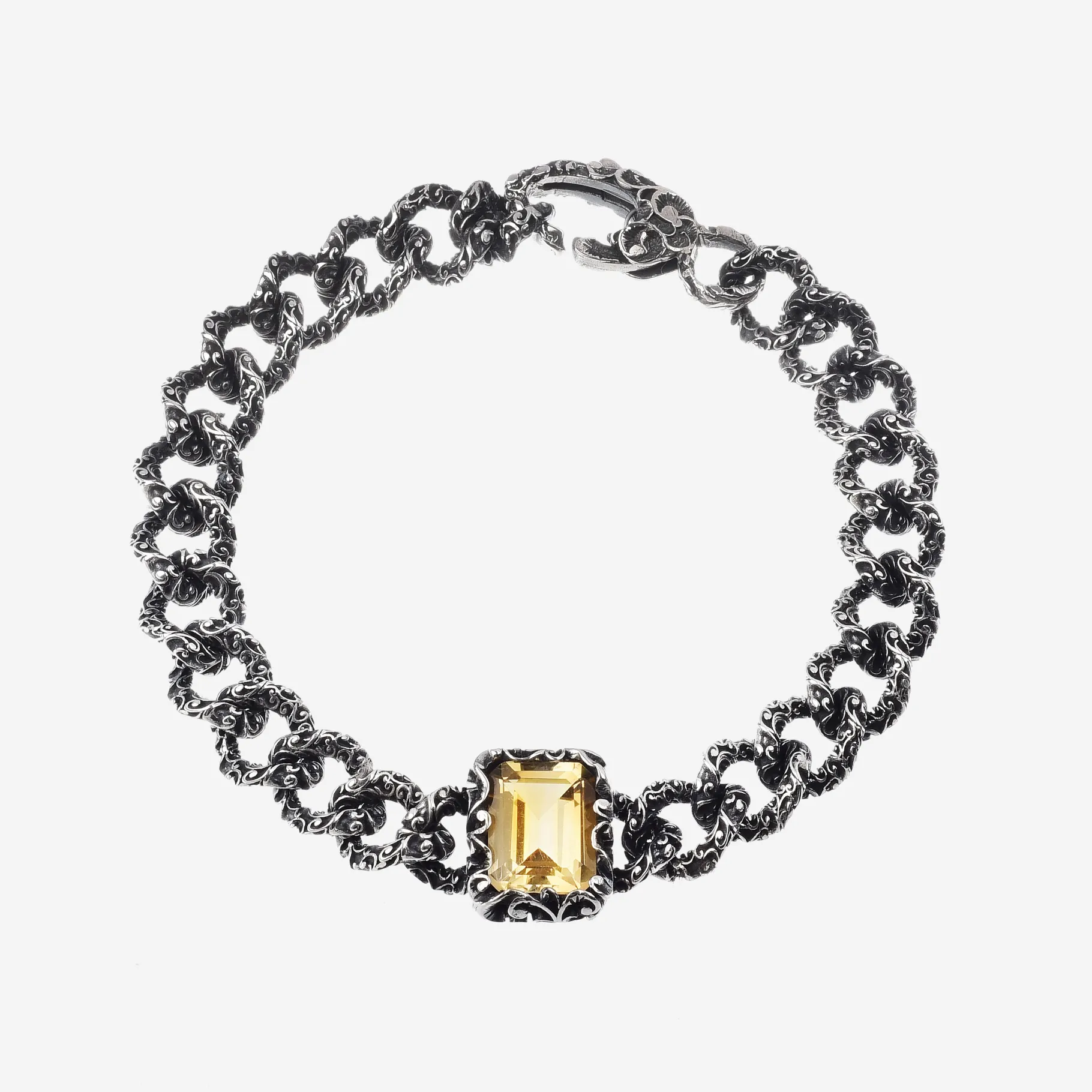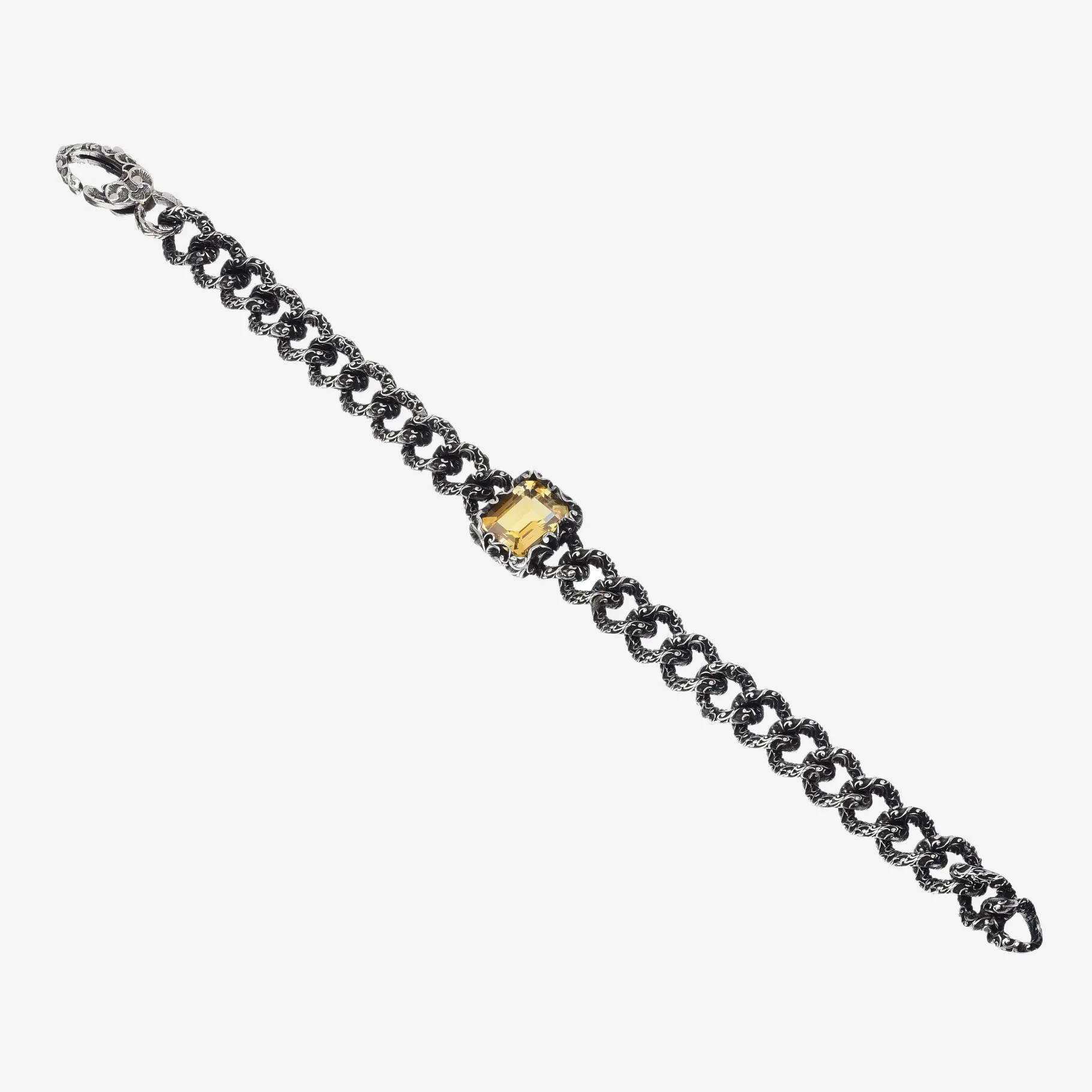 Bracciale groumette in argento brunito intagliato arricchito da una pietra centrale rettangolare in Quarzo Citrino naturale. Un accessorio di carattere per donne che amano distinguersi.