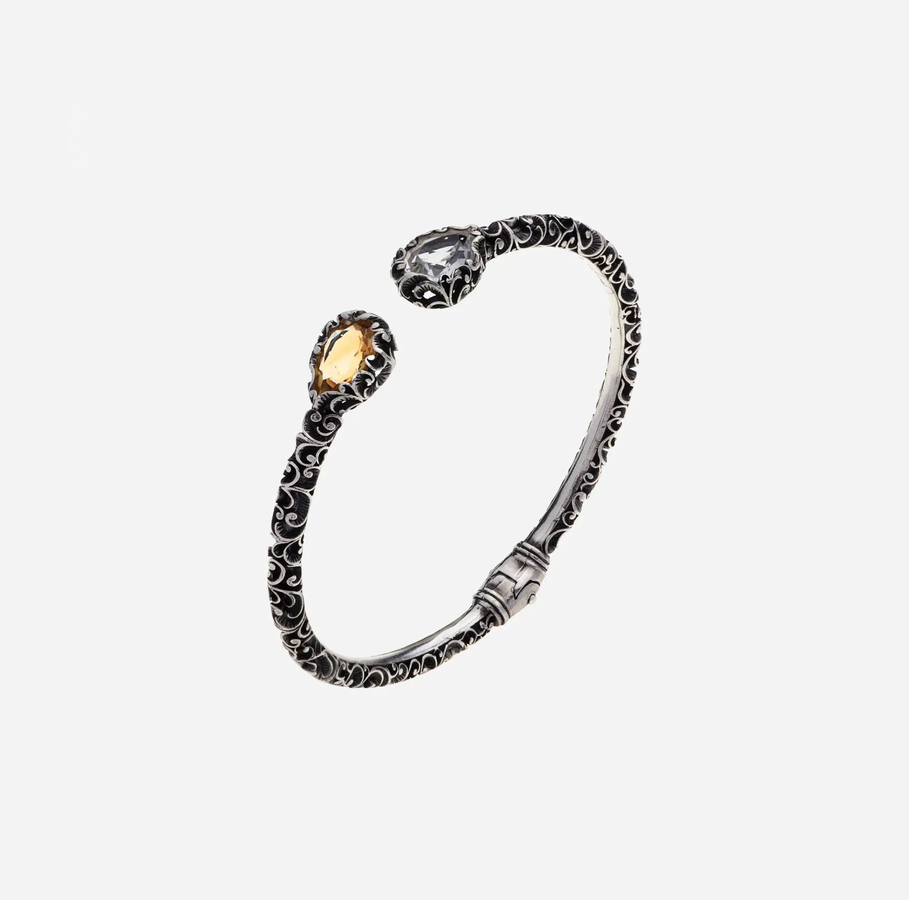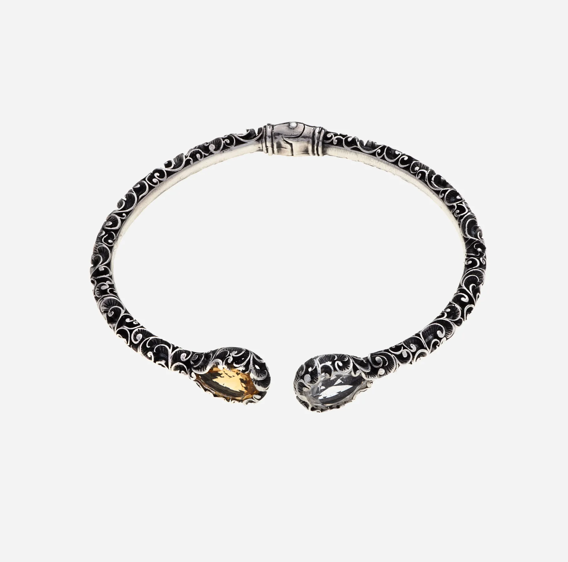 Bracciale Gioiosa in argento brunito inciso a mano con l’antica tecnica del bulino e due pietre naturali taglio a goccia in chiusura. Questo gioiello è stato pensato per diventare un amico inseparabile che proprio per la sua versatilità è adatto ad ogni occasione.