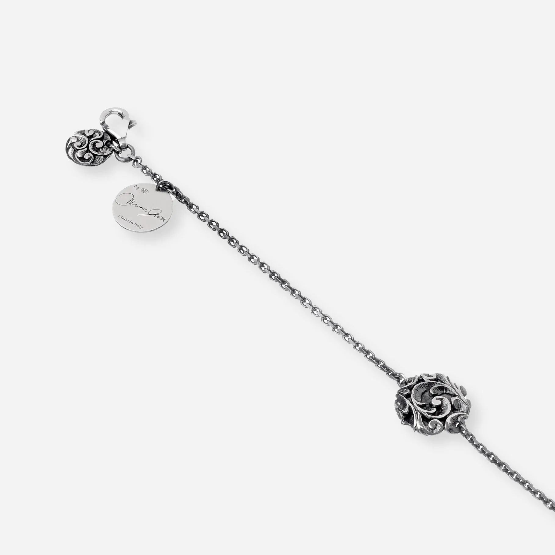Bracciale in argento impreziosito da una lenticchia centrale in argento brunito inciso a mano con l’antica tecnica e una piccola piccola pendente vicino alla chiusura a moschettone.