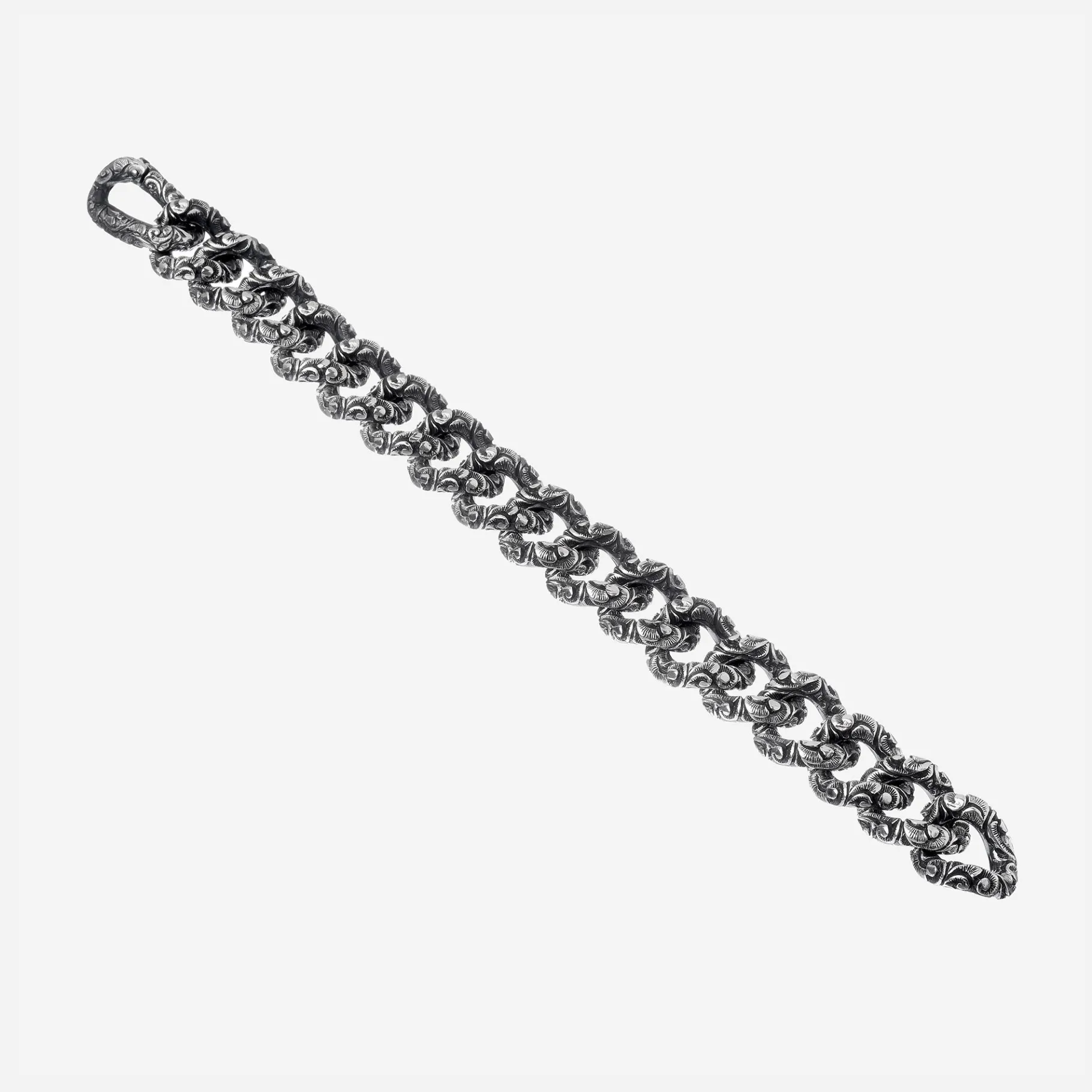 Questo bracciale groumette è una vera e propria opera d’arte della gioielleria. Le maglie medie bombate in argento brunito inciso a mano conferiscono profonda tridimensionalità intrecciate con continuità grazie alla chiusura a scomparsa.
