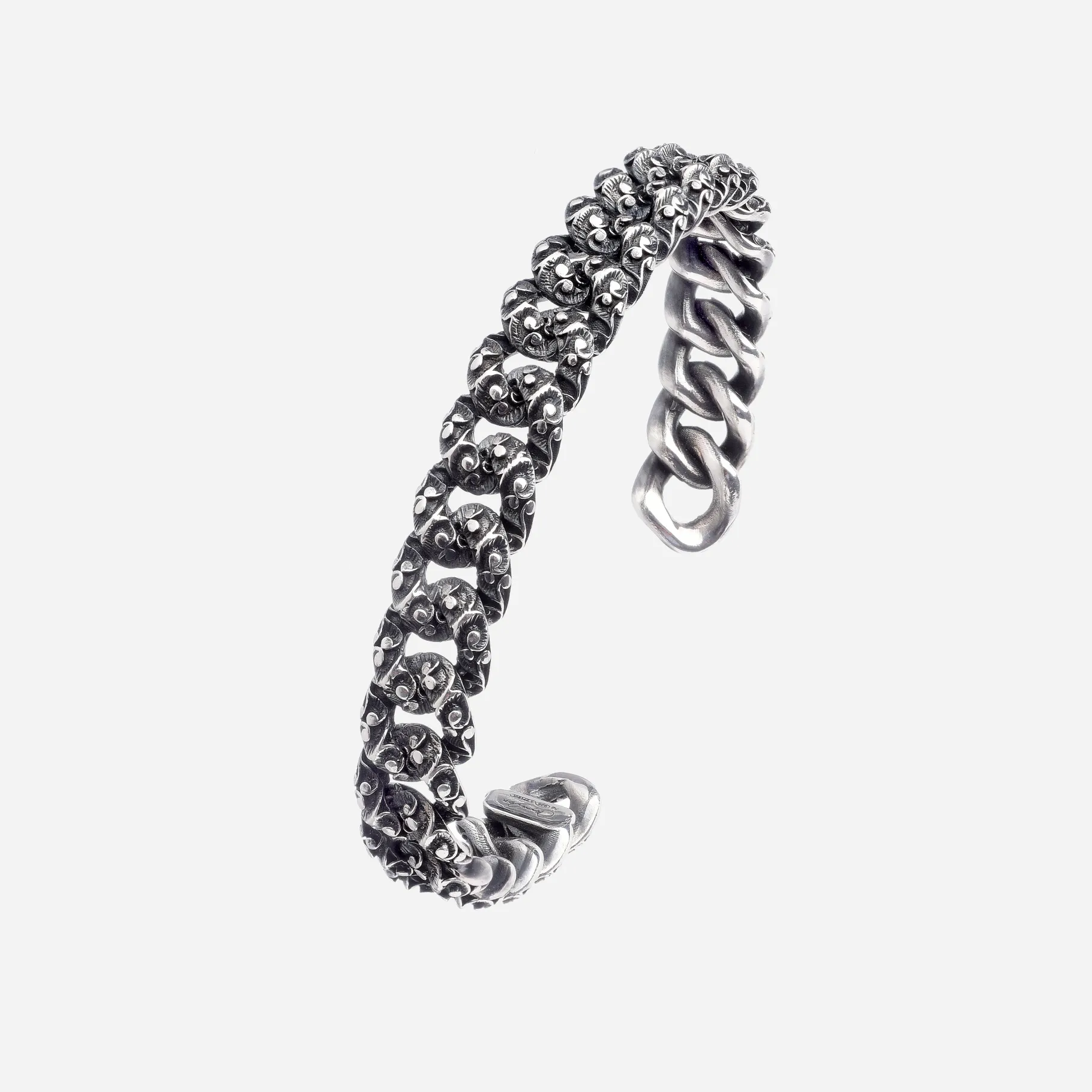 Bracciale a schiava con groumette rigida in argento brunito inciso a mano con l’antica tecnica del bulino. Un bracciale dalle linee antiche, ma dal fascino moderno. Perfetto per essere indossato con un anello della collezione.