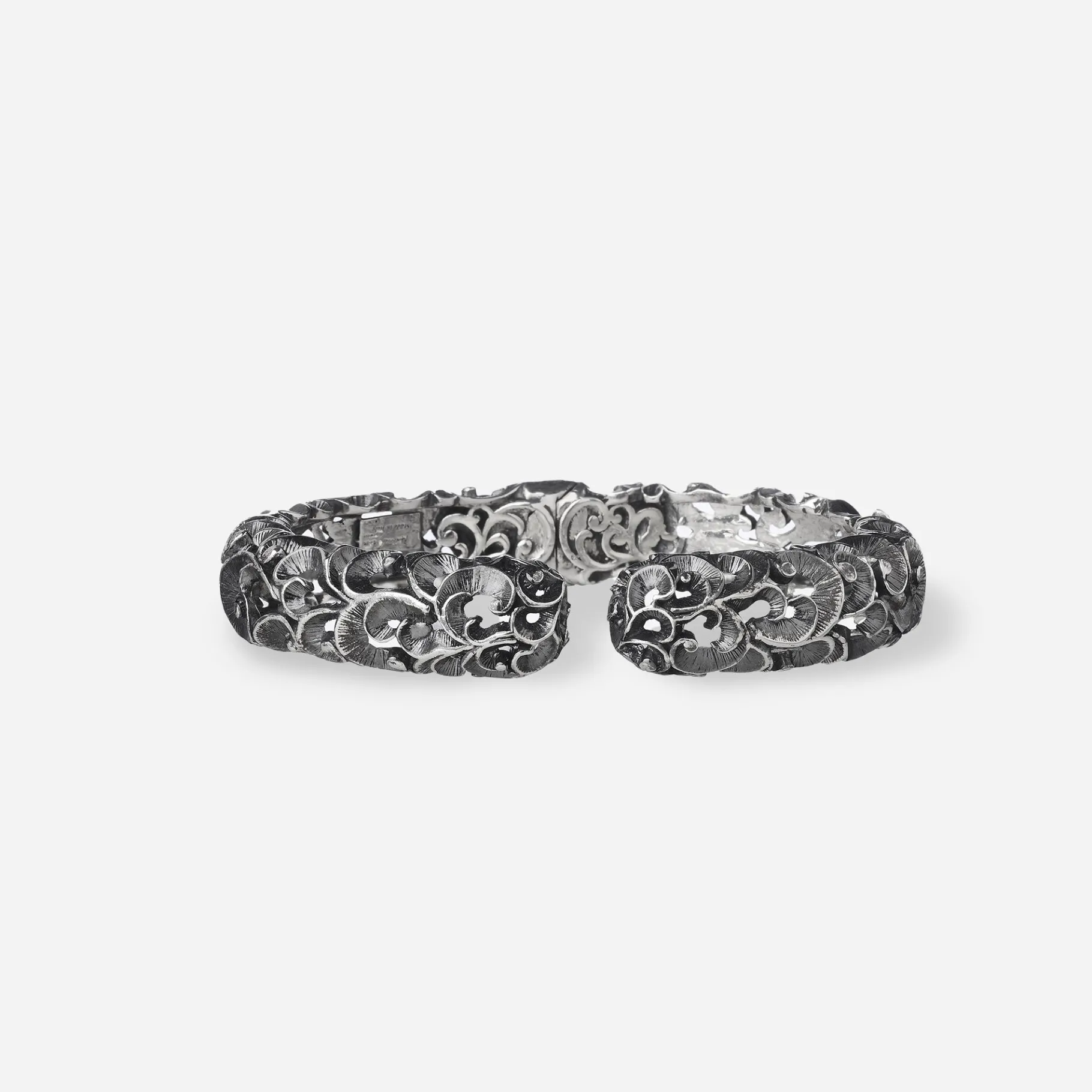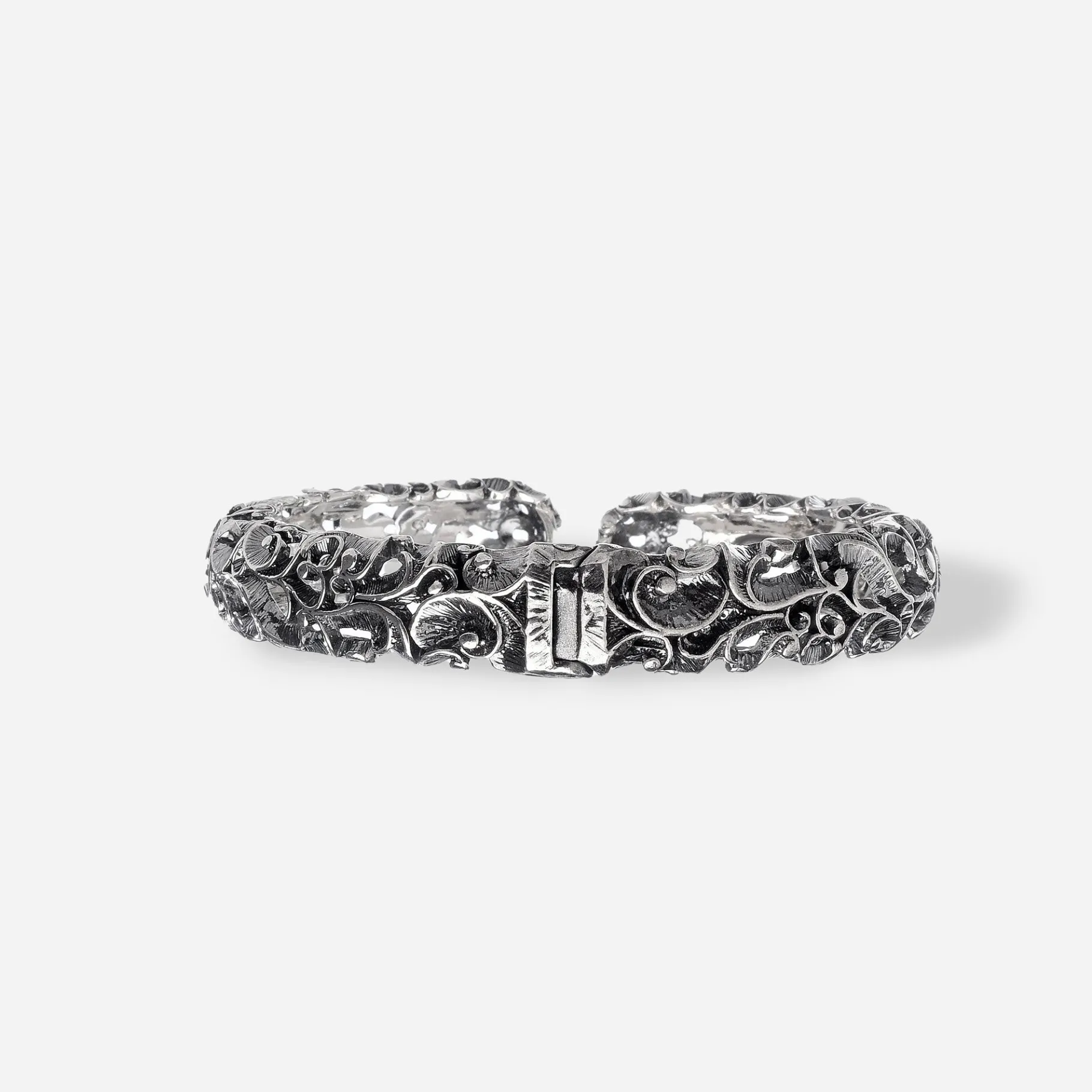 Il bracciale contrarié rigido è un must have sempre attuale. In questa versione stretta in argento brunito inciso, è leggero e comodo da indossare. L’apertura centrale nascosta ne facilità la portabilità.