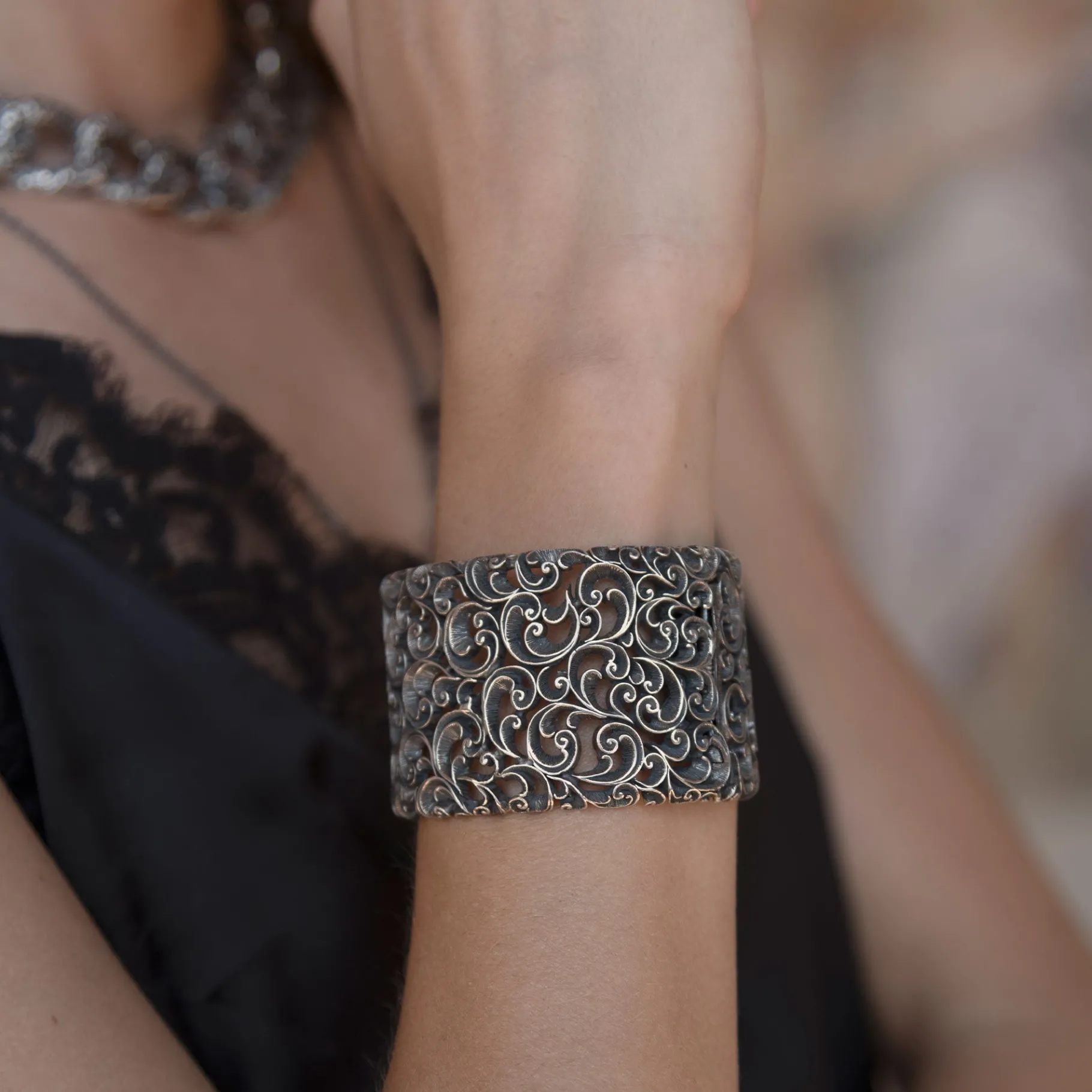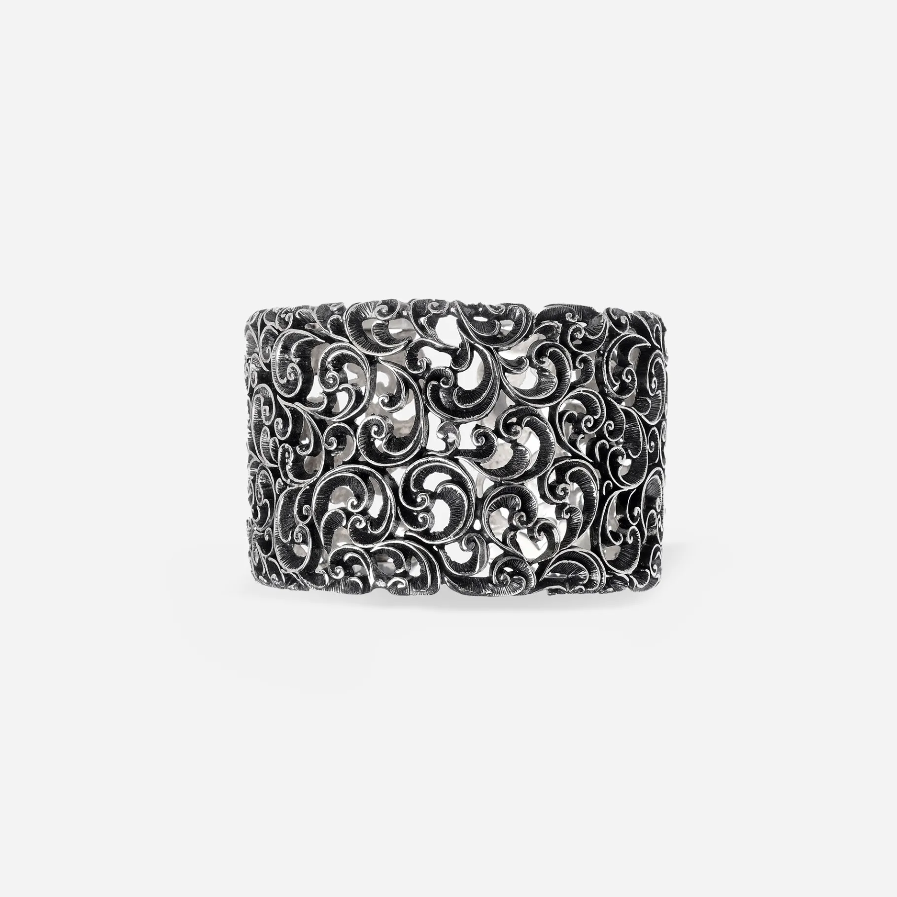 Il bracciale rigido a manetta larga in è uno dei bracciali più iconici della collezione in argento. Le sue linee damascate e l’intarsio fine creano un gioco di luce e contrasti che conferiscono preziosità e carattere. La chiusura perfettamente nascosta e integrata nella struttura inoltre lo rende pratico da indossare.