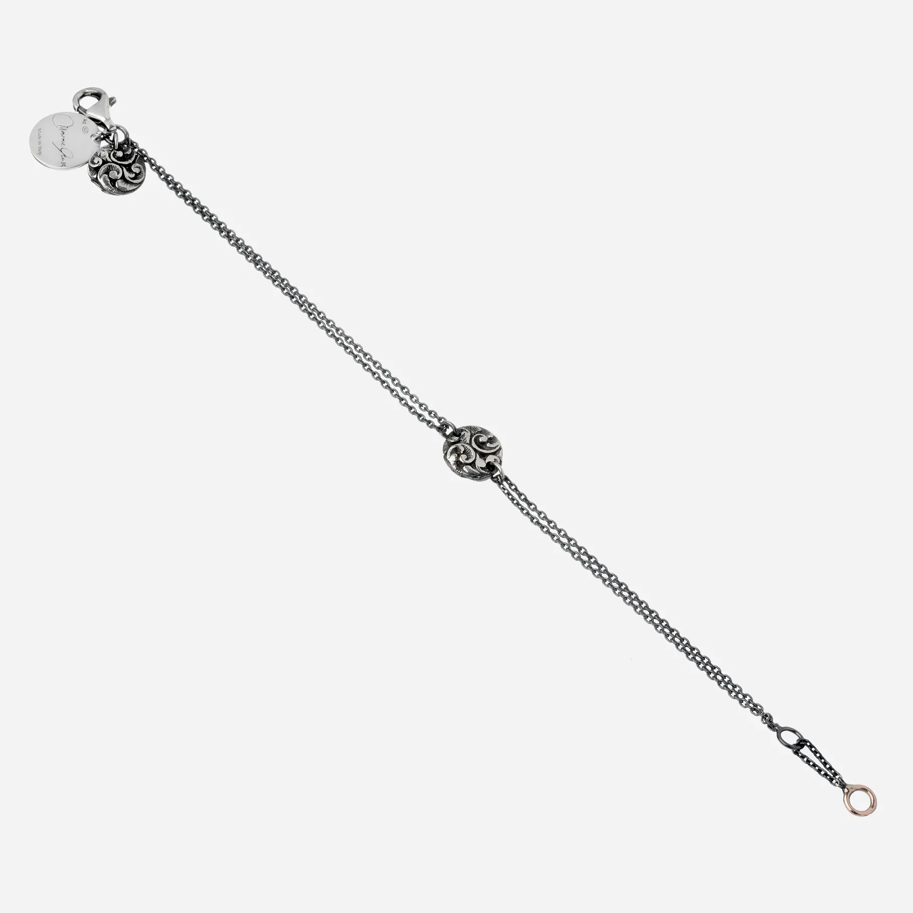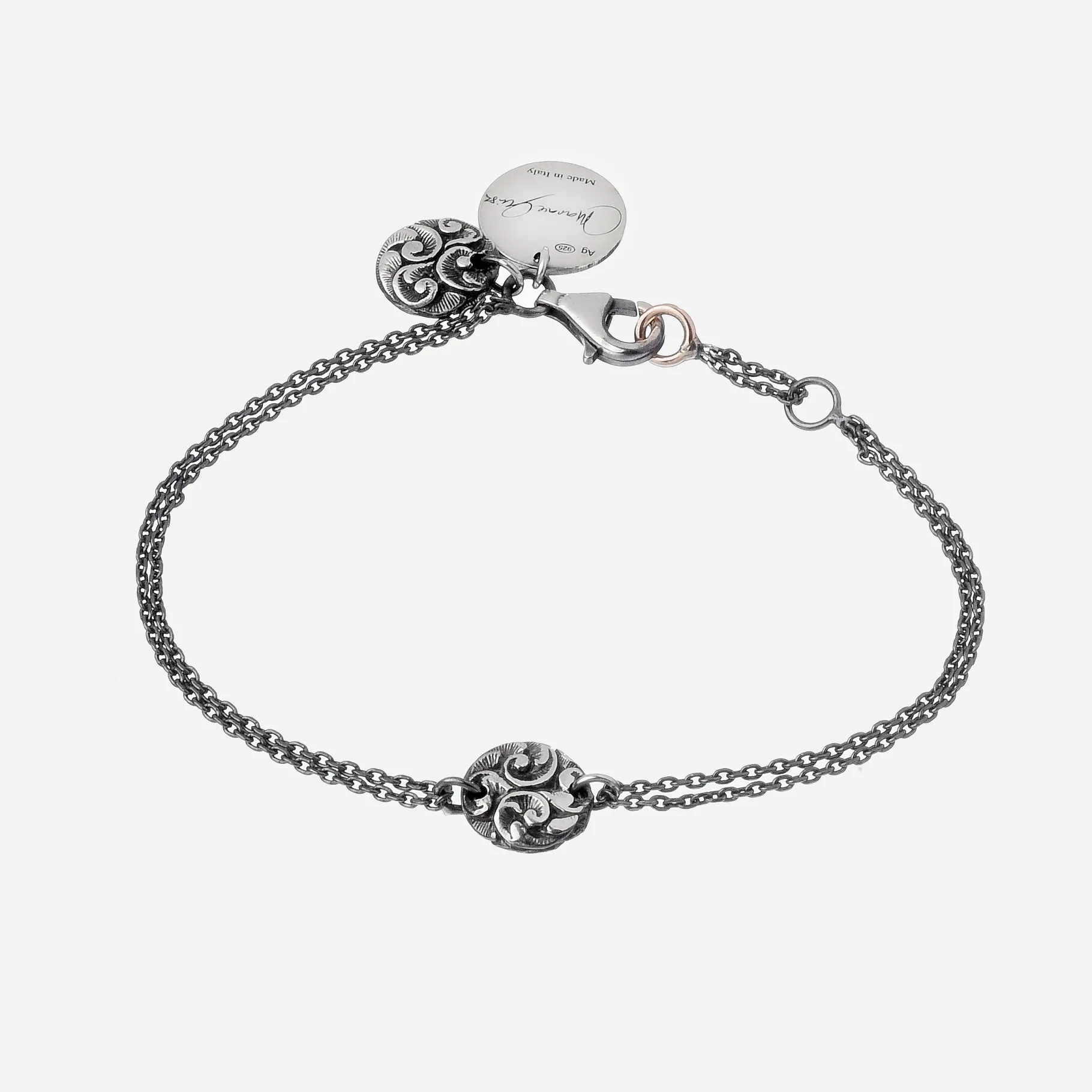 Bracciale in argento brunito con lenticchia centrale piccola, catena forzatina e lenticchia pendente vicino alla chiusura con moschettone. Un bracciale indispensabile per donne e uomini di classe che non vogliono rinunciare ad un accessorio unico.