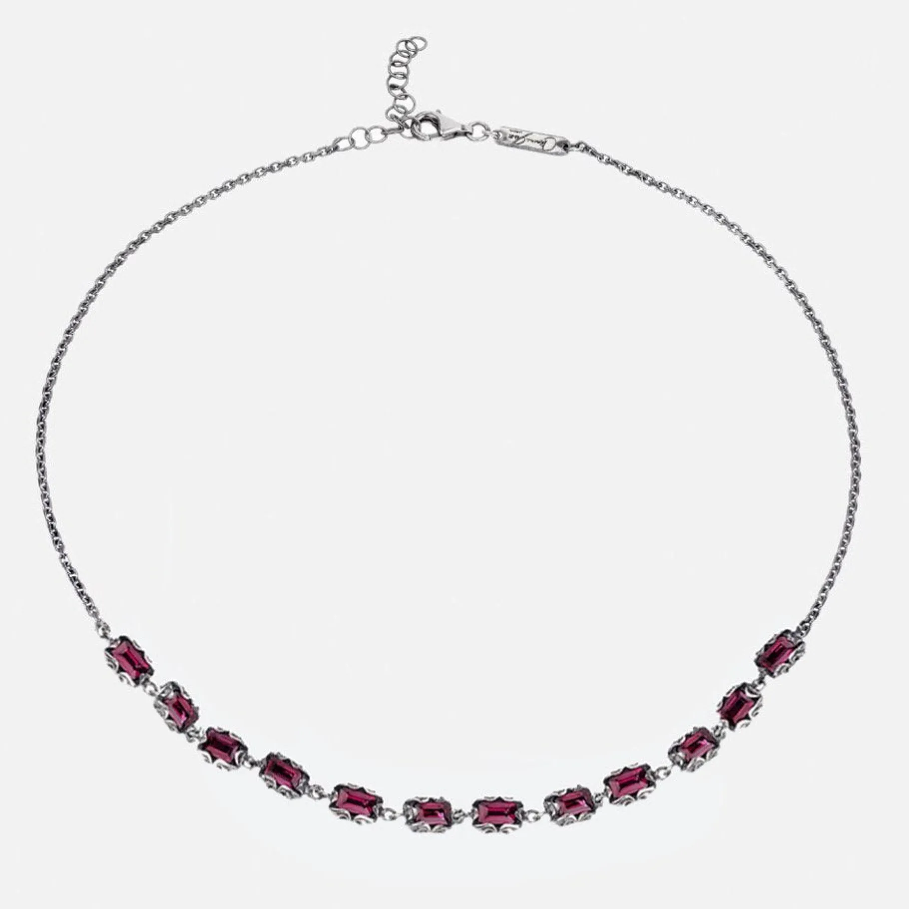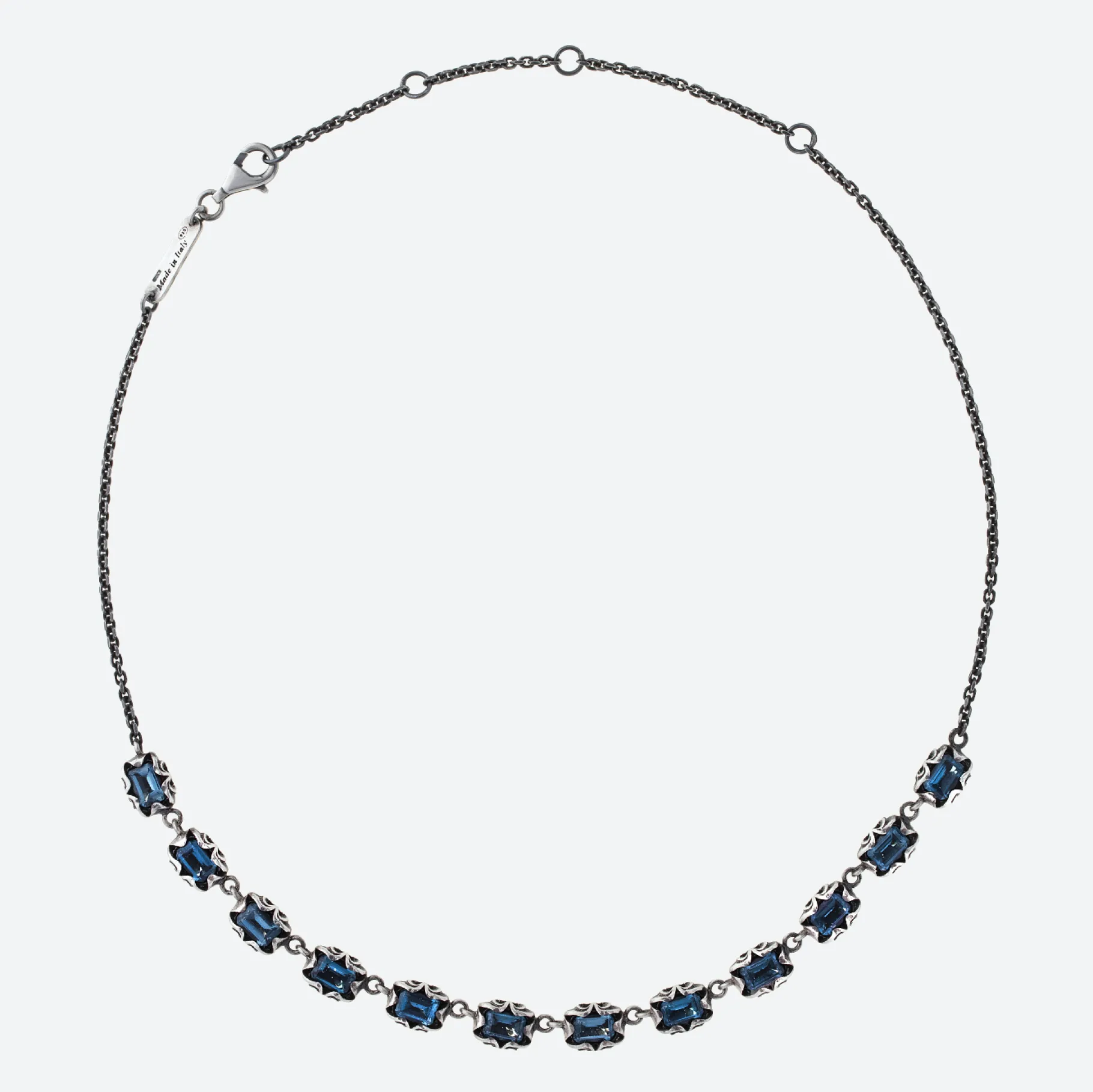 Collana girocollo della collezione Shri in argento brunito inciso a mano da maestri orafi Italiani con 12 pietre dal taglio smeraldo (6×4 mm). Illumina il tuo look con il colore intenso delle pietre naturali.