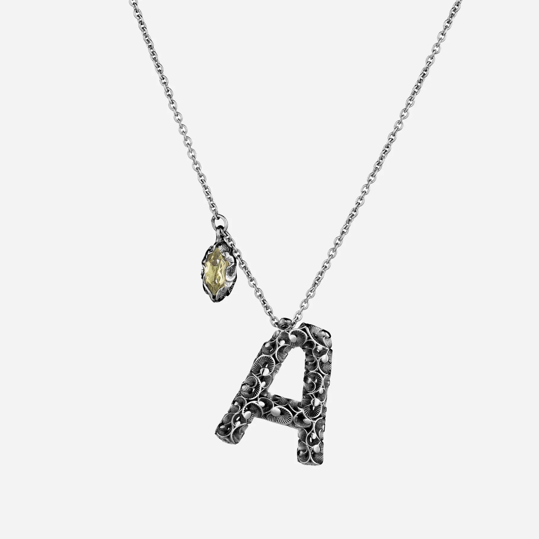 A come… solo tu lo puoi sapere. Questa collana con ciondolo a lettera è A è impreziosito dai nostri artigiani con un punto luce in pietra naturale Prasiolite.