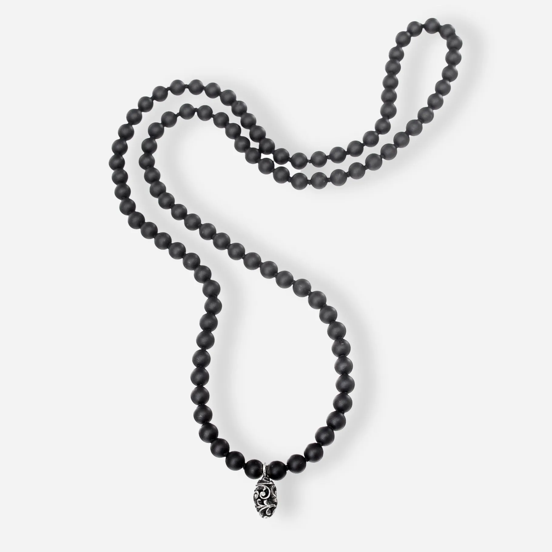 Collana della collezione Nomad con 101 sfere da 6 mm di onici opachi e pendente shiva lingam in argento intagliato a mano con la tecnica del bulino. Una collana per lui e per lei, da indossare tutti i giorni.
