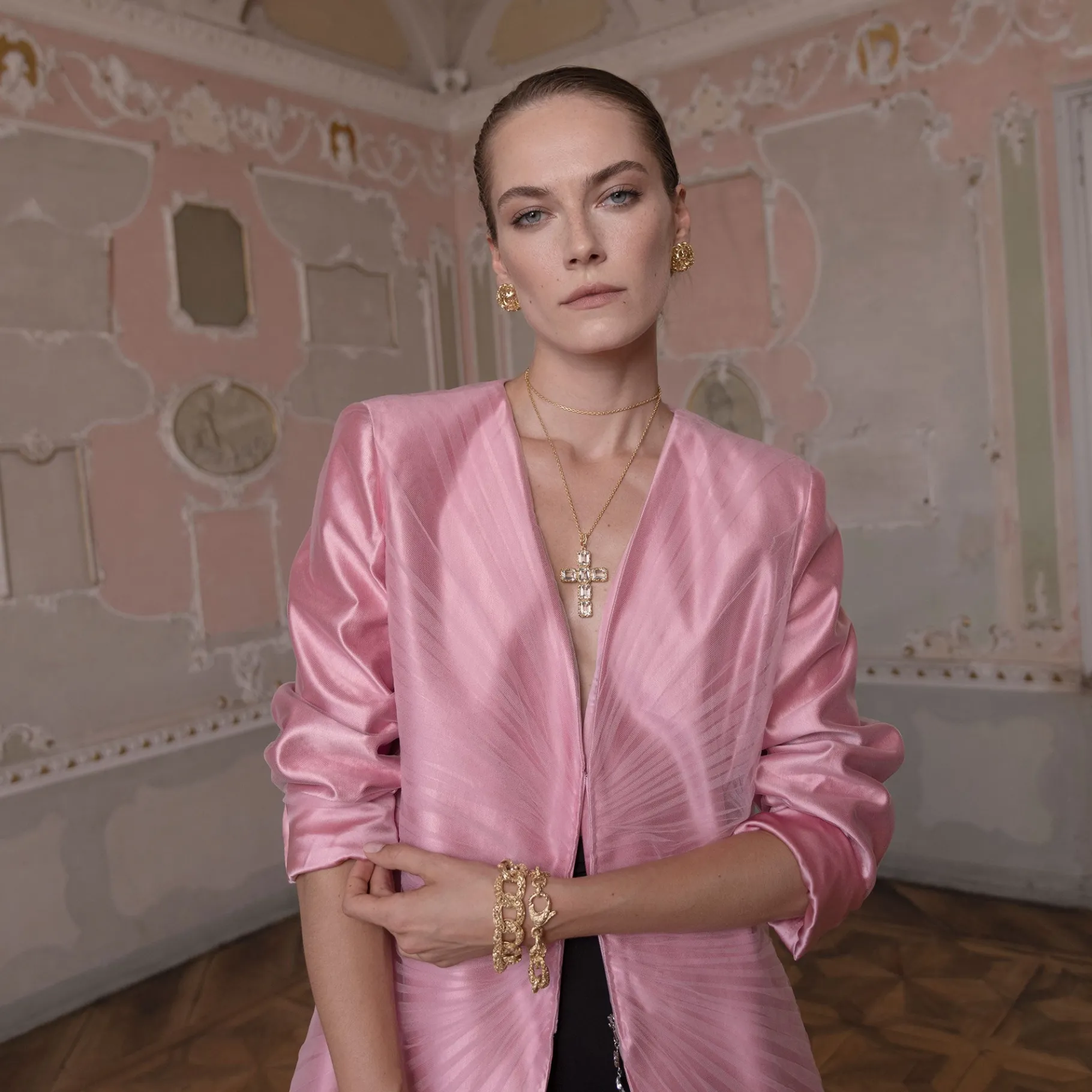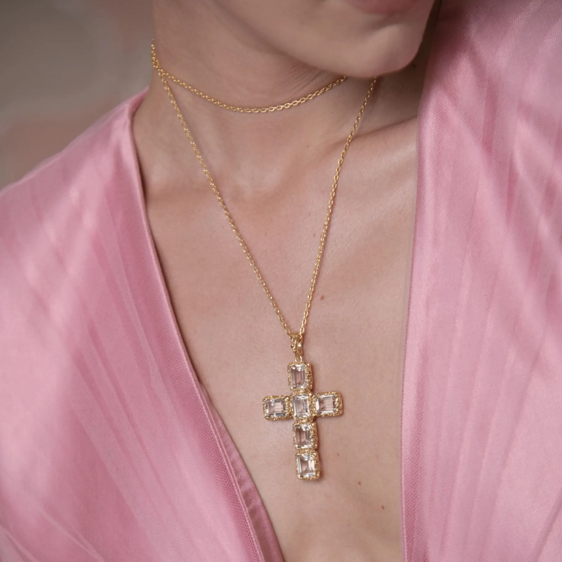 La collana con pendente a croce dorata con 6 pietre in Cristallo di Rocca taglio smeraldo è un dettaglio prezioso che arricchisce e illumina che la indossa.