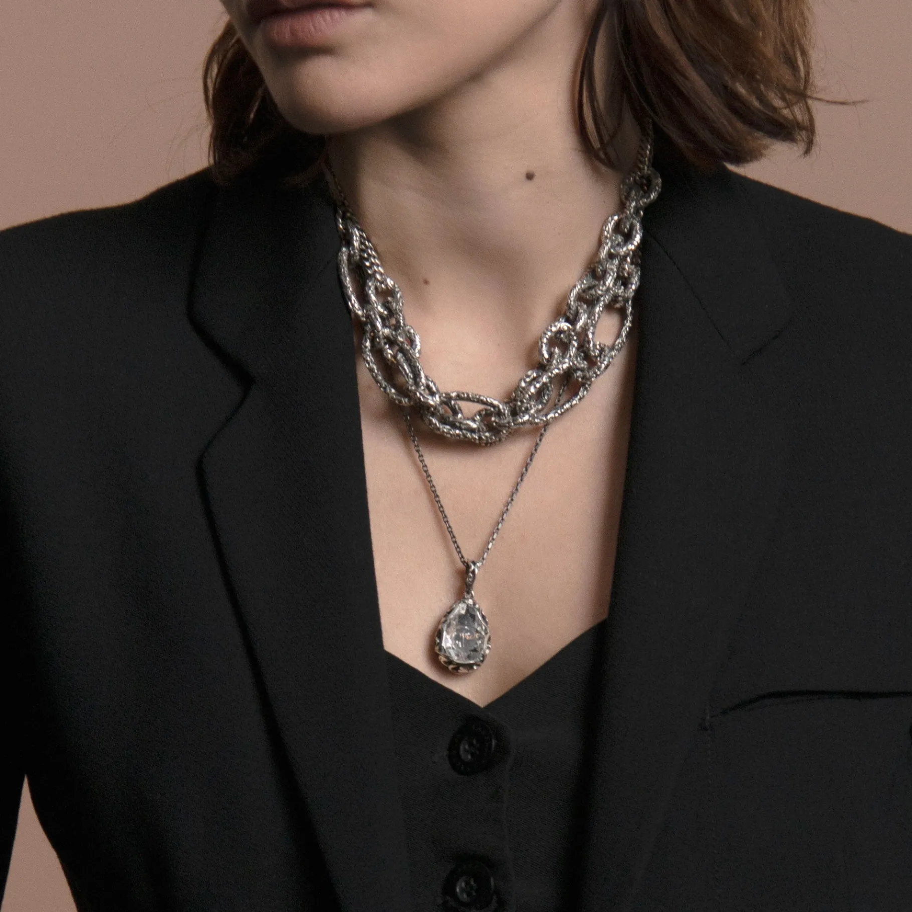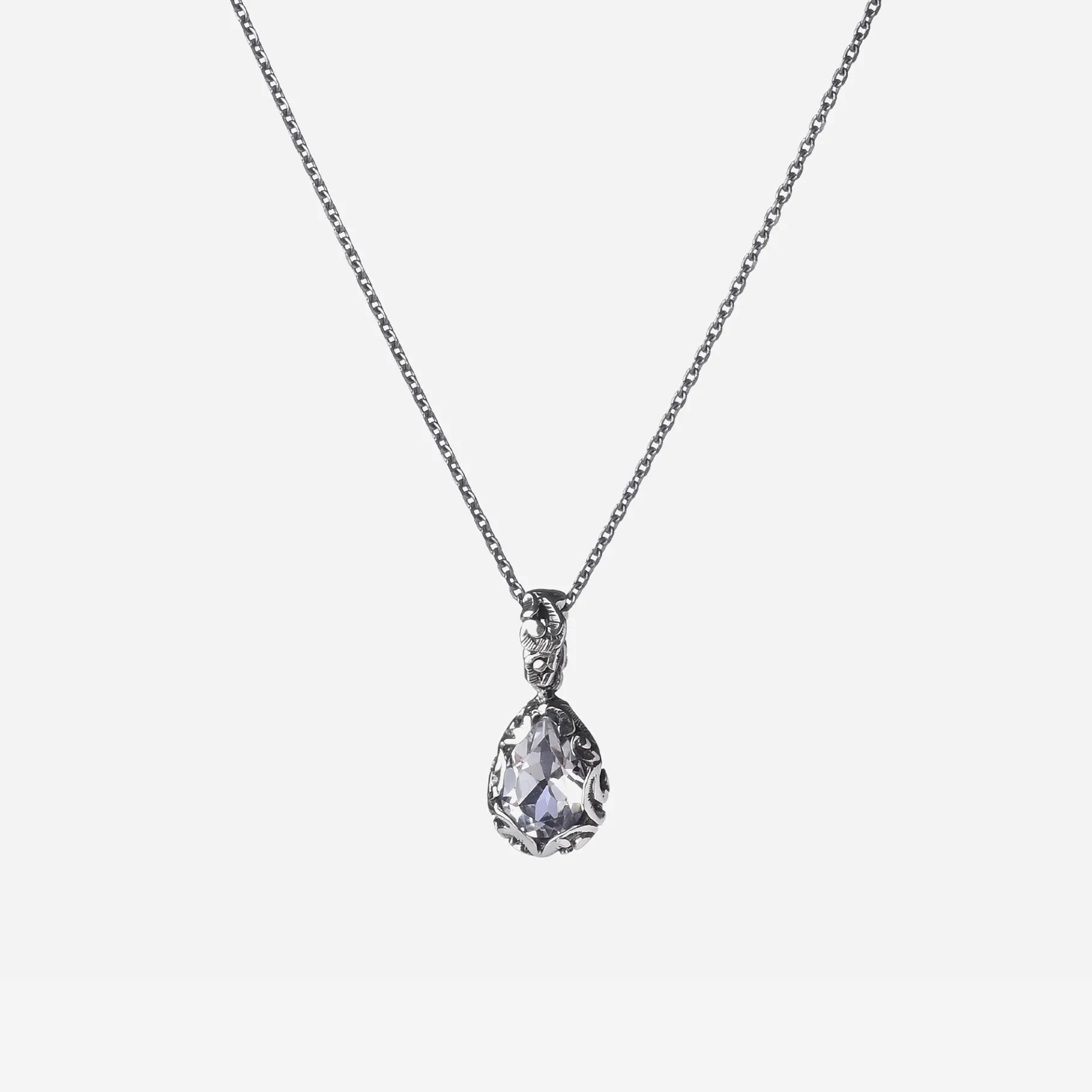 Collana girocollo in argento con pendente in argento brunito inciso e pietra a goccia dal taglio sfaccettato . Un accessorio dalle linee semplici e dal design unico.