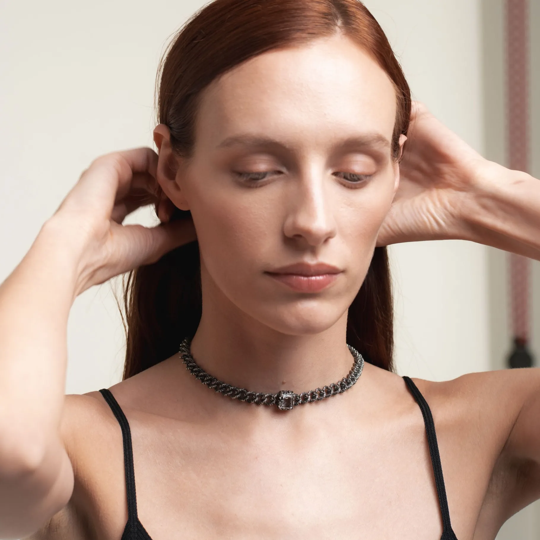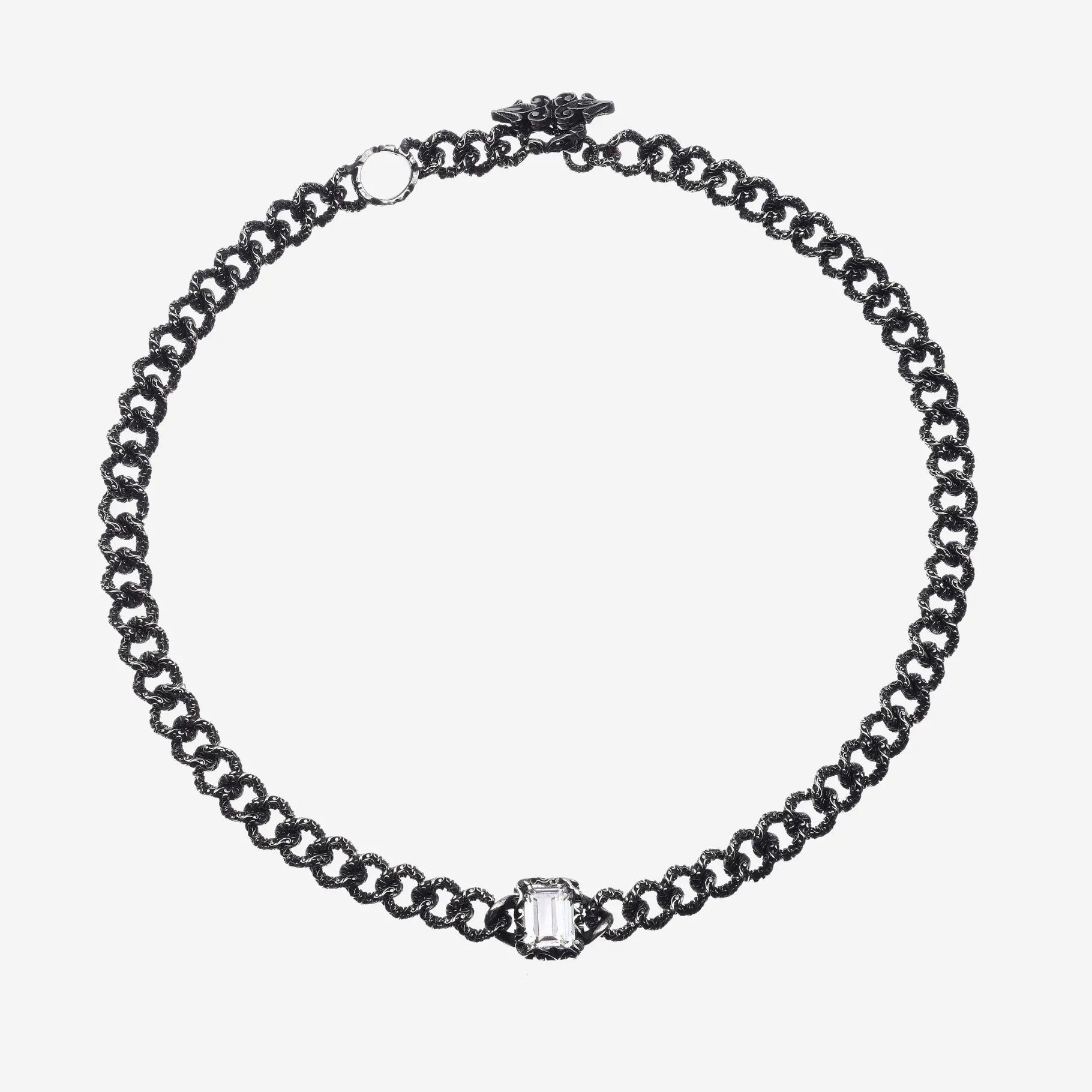 Collana girocollo Eternity Groumette in argento brunito con pietra centrale Cristallo di Rocca dal taglio smeraldo. Preziosa e ricercata, questa collana arricchisce il décolleté da sola.