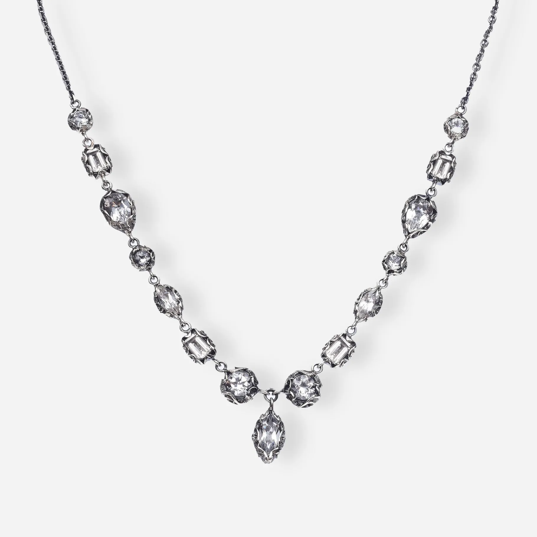 Collana della capsule Shri in argento brunito inciso a bulino. 15 pietre dal taglio misto in Cristallo di Rocca naturale si alternano a comporre un gioiello dalla luce unica con una pietra centrale dal taglio navetta.