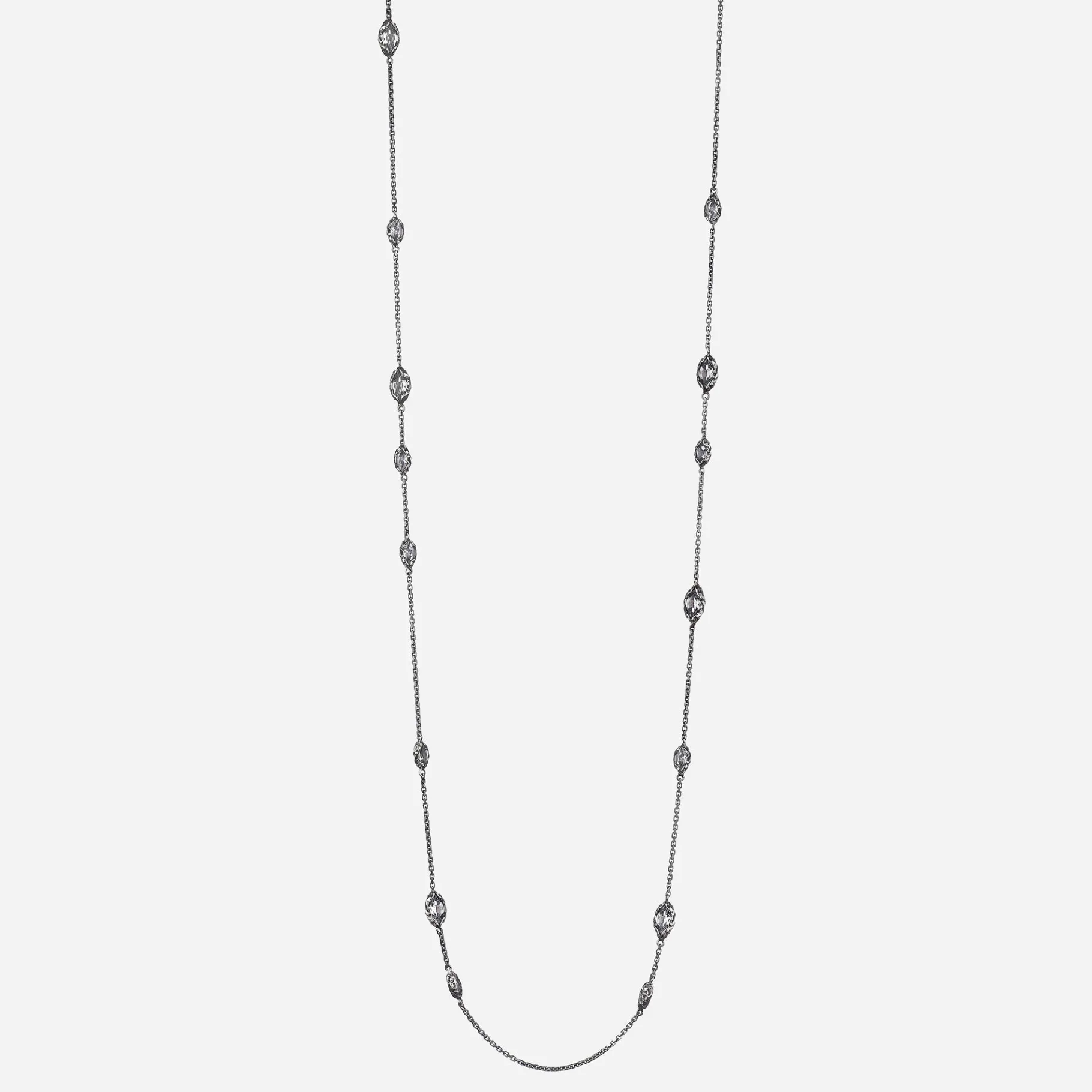 La Collana Shri in argento è unica per la sua lunghezza in cui si alternano pietre naturali Cristallo di Rocca in taglio navetta di diverse dimensioni. Un accessorio perfetto per dare luce agli outfit di tutti i giorni.