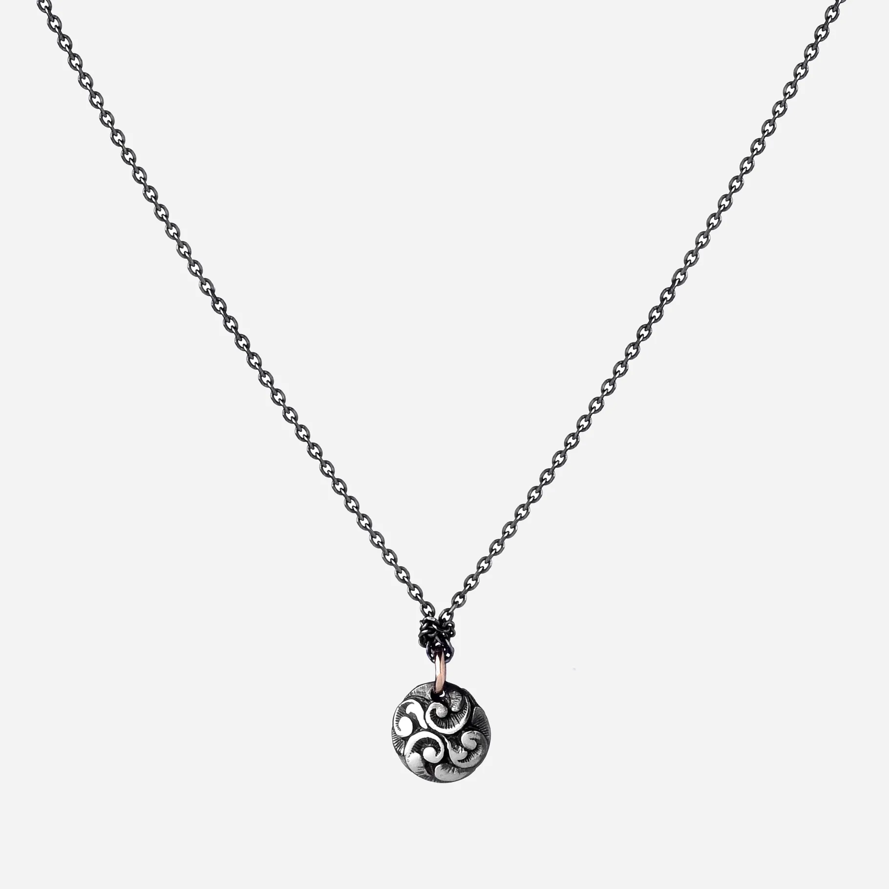 Collana a girocollo con contromaglia in oro rosa 9 carati, catena forzatina e lenticchia piccola in argento brunito inciso a mano con l’antica tecnica del bulino. Chiusura a moschettone. Una vera chicca della collezione per amanti del bon-ton.