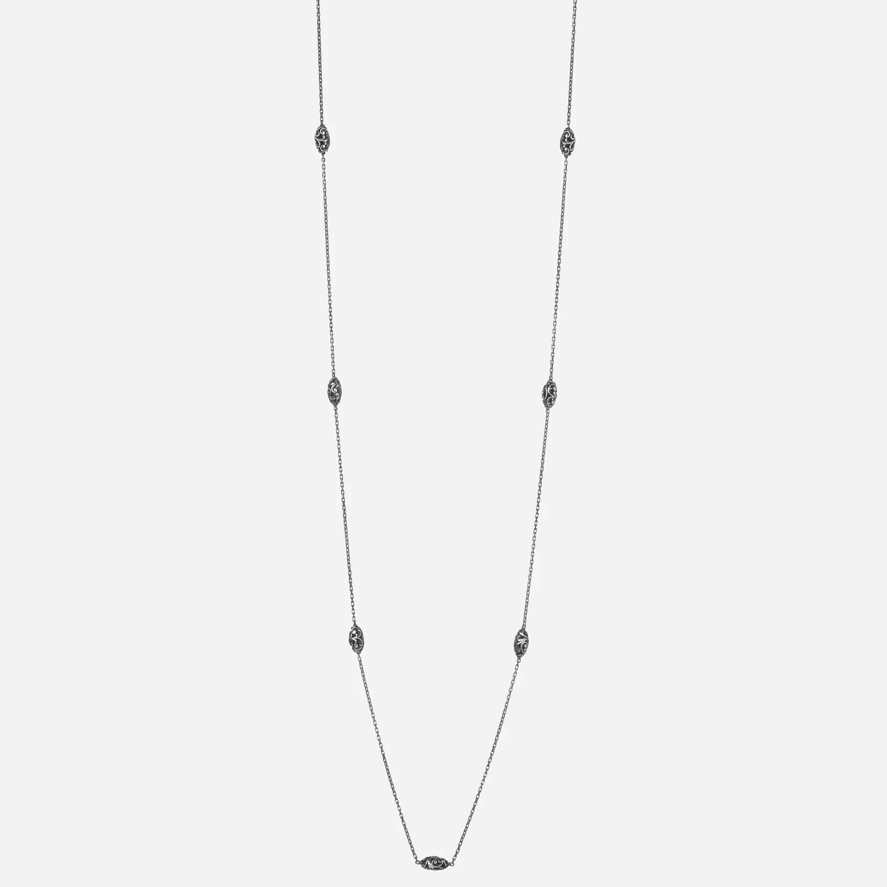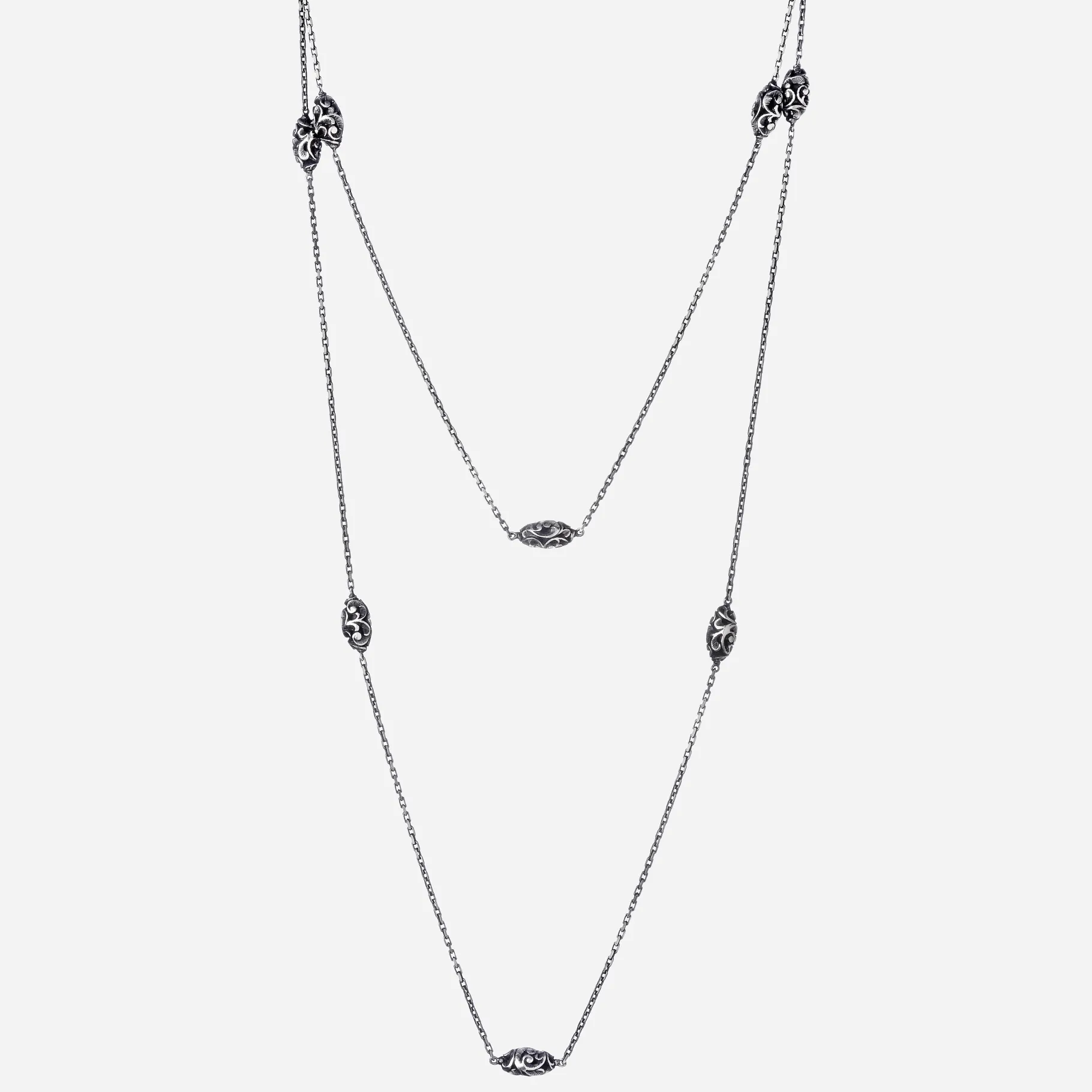 Collana lunga con elementi shiva lingam in argento brunito inciso a mano con l’antica tecnica del bulino. Una collana che puoi indossare a più lunghezze per personalizzare il tuo outfit e impreziosirlo.
