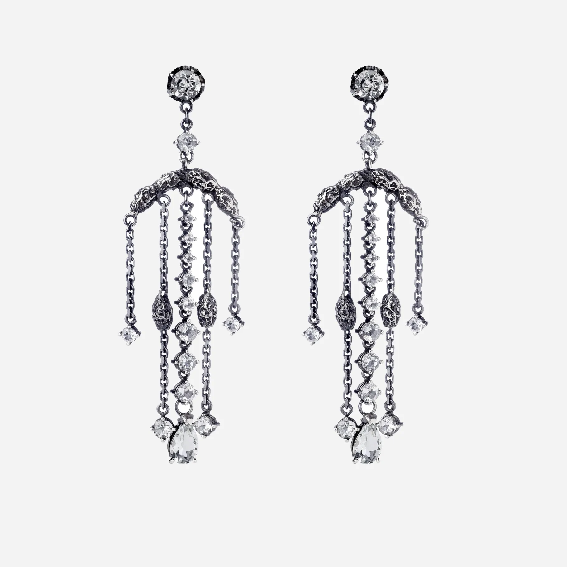 Questi orecchini chandelier in argento si differenziano per la pietra naturale di 6 mm incastonata sul lobo, dal taglio tondo e sfaccettato. La classica cascata di pietre rende questo accessorio prezioso e inconfondibile fra tutti.