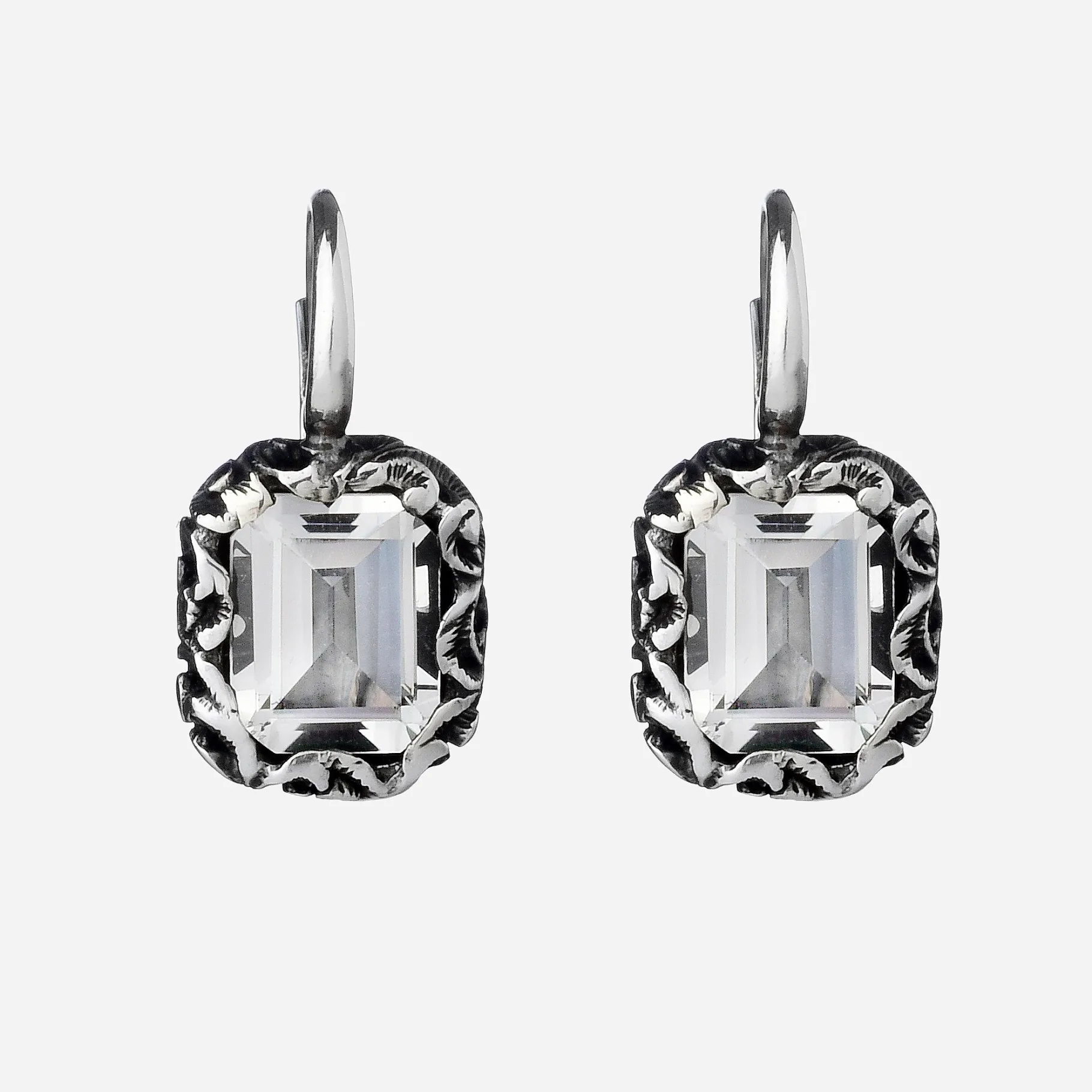 Orecchini a monachella con pietra rettangolo naturale, taglio smeraldo. Orecchino in argento lavorato a mano e inciso al bulino da migliori maestri orafi italiani. Un accessorio perfetto per una donna che vuole essere raffinata in qualsiasi momento.