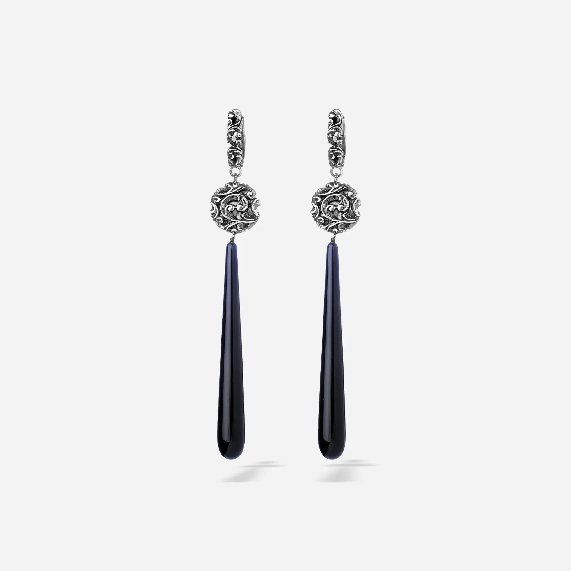 Orecchini in argento brunito con pietra a goccia pendente in Onice naturale. Un tocco di eleganza che slancia lo sguardo.
