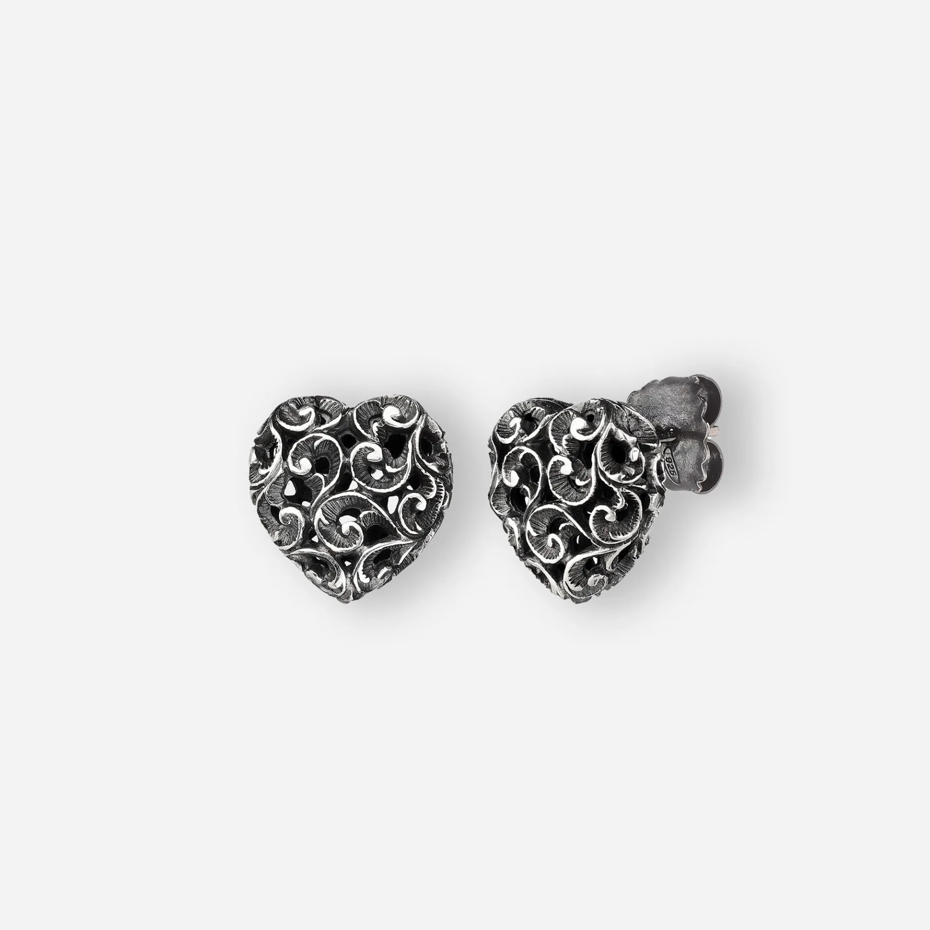Questi orecchini a lobo hanno un cuore intagliato in argento brunito. Un cuore simbolo di ricercatezza, di amore e di passione.