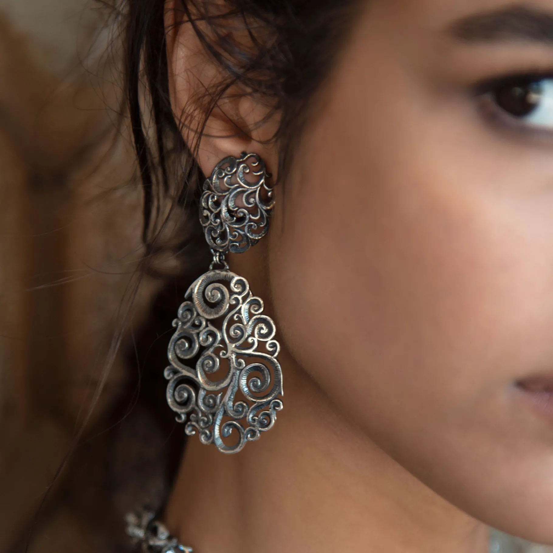 Orecchini della collezione Opera con doppio rosone in argento brunito inciso a mano. Un accessorio unico, ispirato dall’amore per l’arte e il Made in Italy.