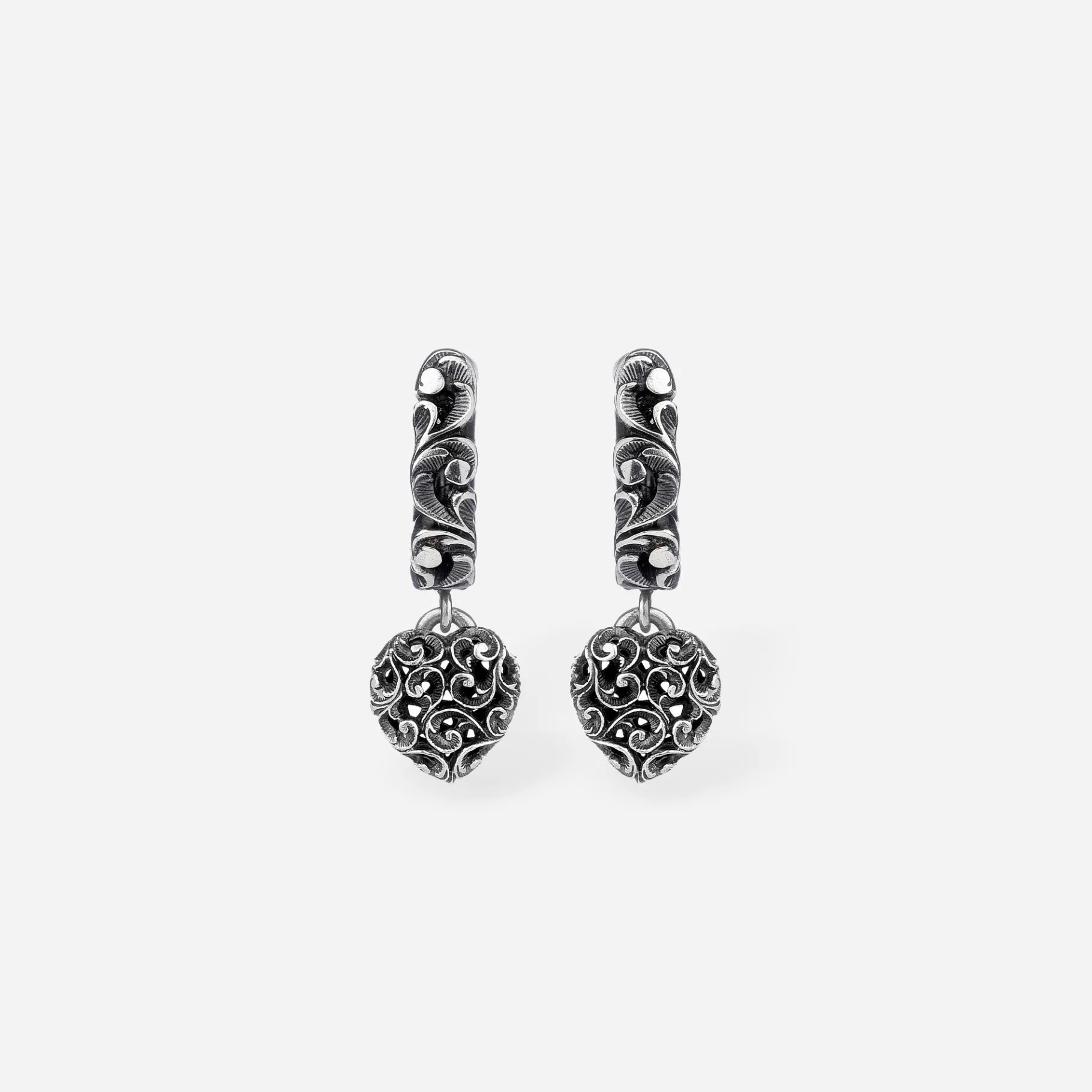 Orecchini Shakti Love con ciondolo a cuore pendente in argento brunito intagliato e rifinito a mano. Chiusura a scattino. Un amore di orecchino.