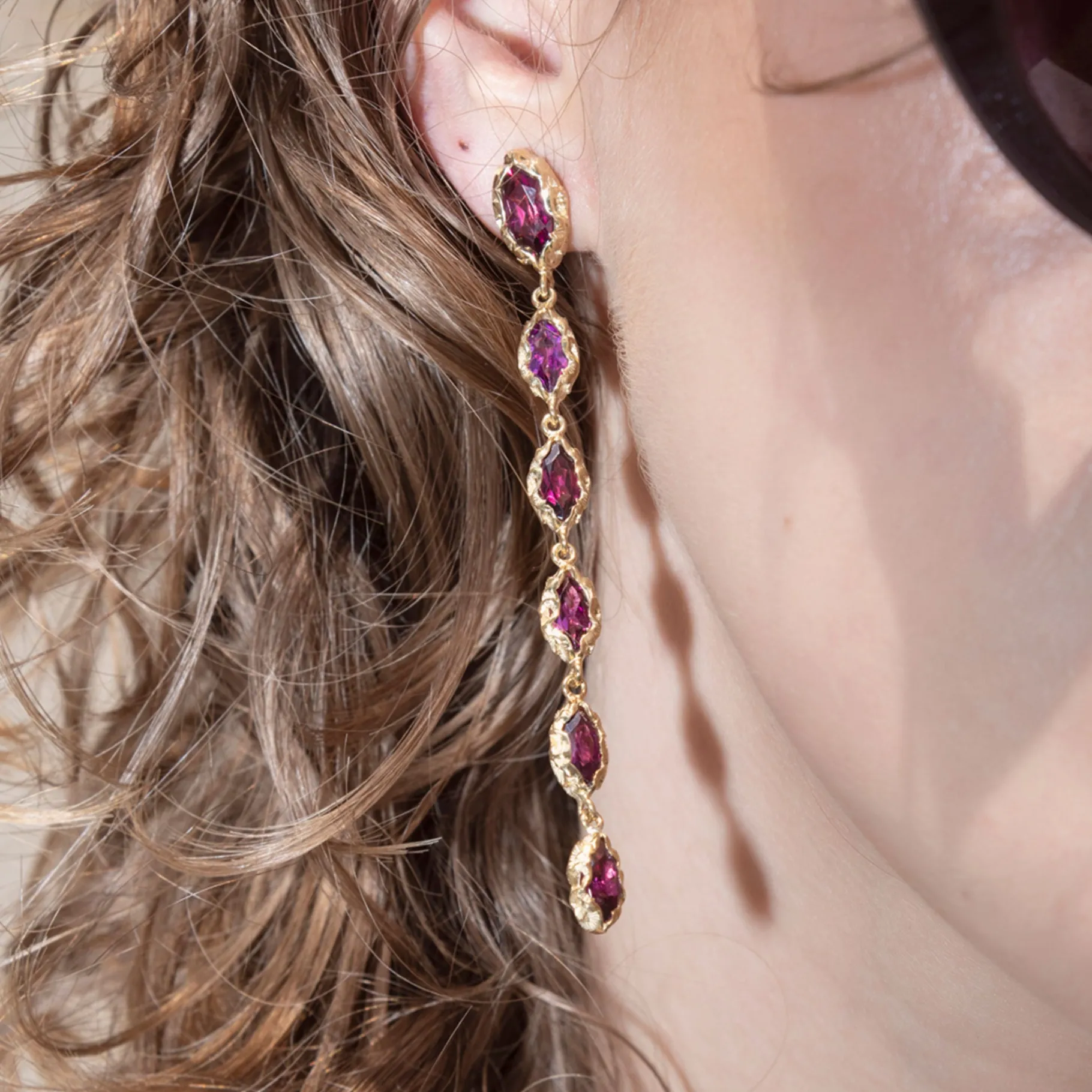Questi orecchini pendenti in argento placcato oro 18 kt sono un’esplosione di luce grazie alle sei pietre di Rodolite rossa dal taglio navette. Indossali per accendere lo sguardo.