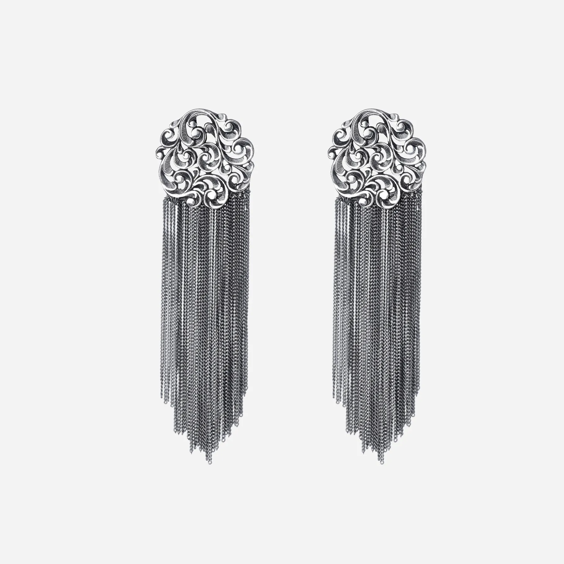 Questi orecchini in argento non passano inosservati. Dal rosone a lobo inciso a mano scende una cascata di catene groumette che dona luce e dinamismo. Un orecchino che esprime in pieno l’animo del marchio, tra romanticismo e design.