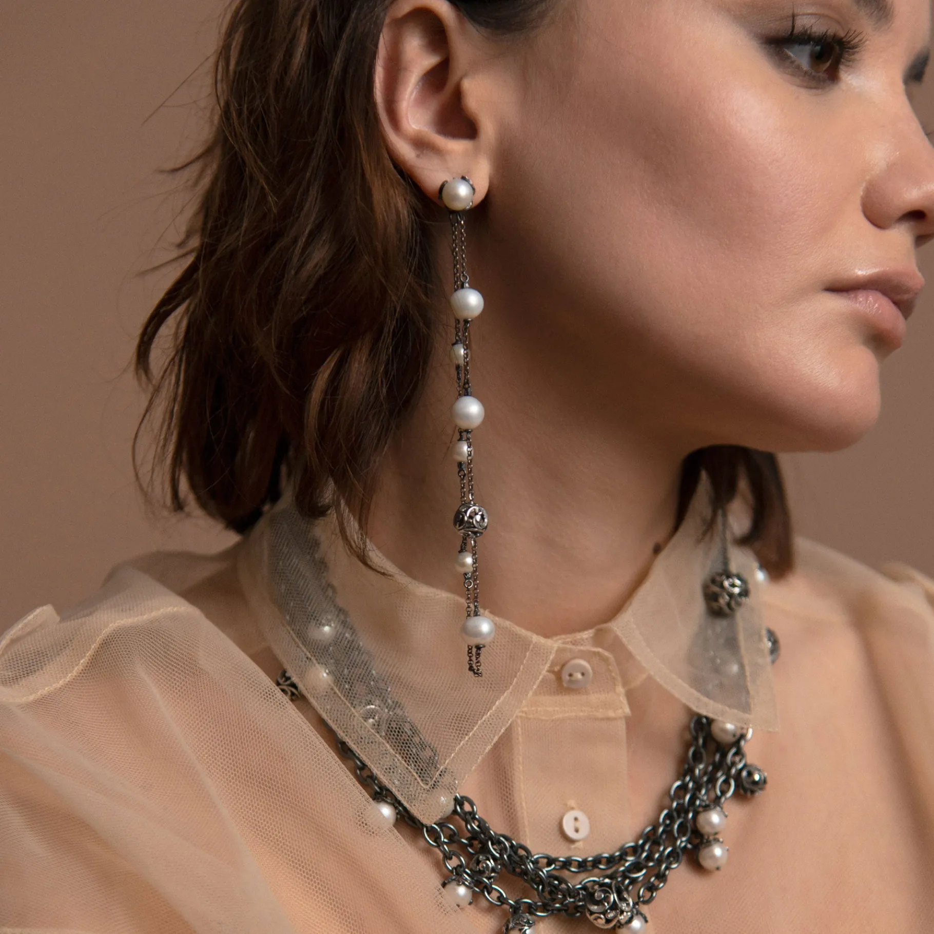 Orecchini pendenti a doppio filo con 6 perle bianche e 1 sfera in argento intagliato. Un accessorio unico capace di regalare ai tuoi look un twist di carattere