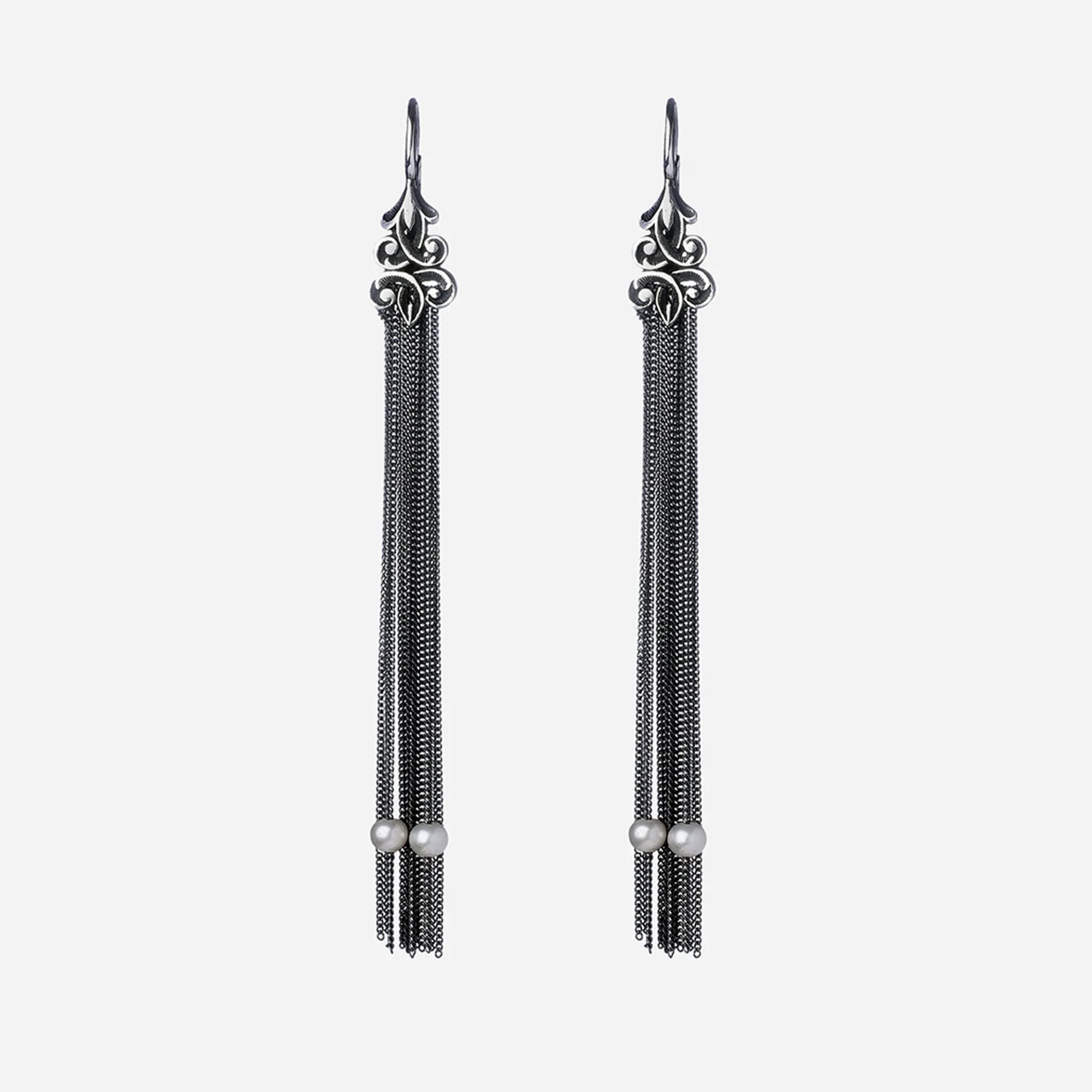 Orecchini a monachella in argento con un giglio a lobo e una cascata di catene forzatina extralong arricchita da piccole perle naturali alla fine. Un accessorio ricco di fascino che completa look audaci.