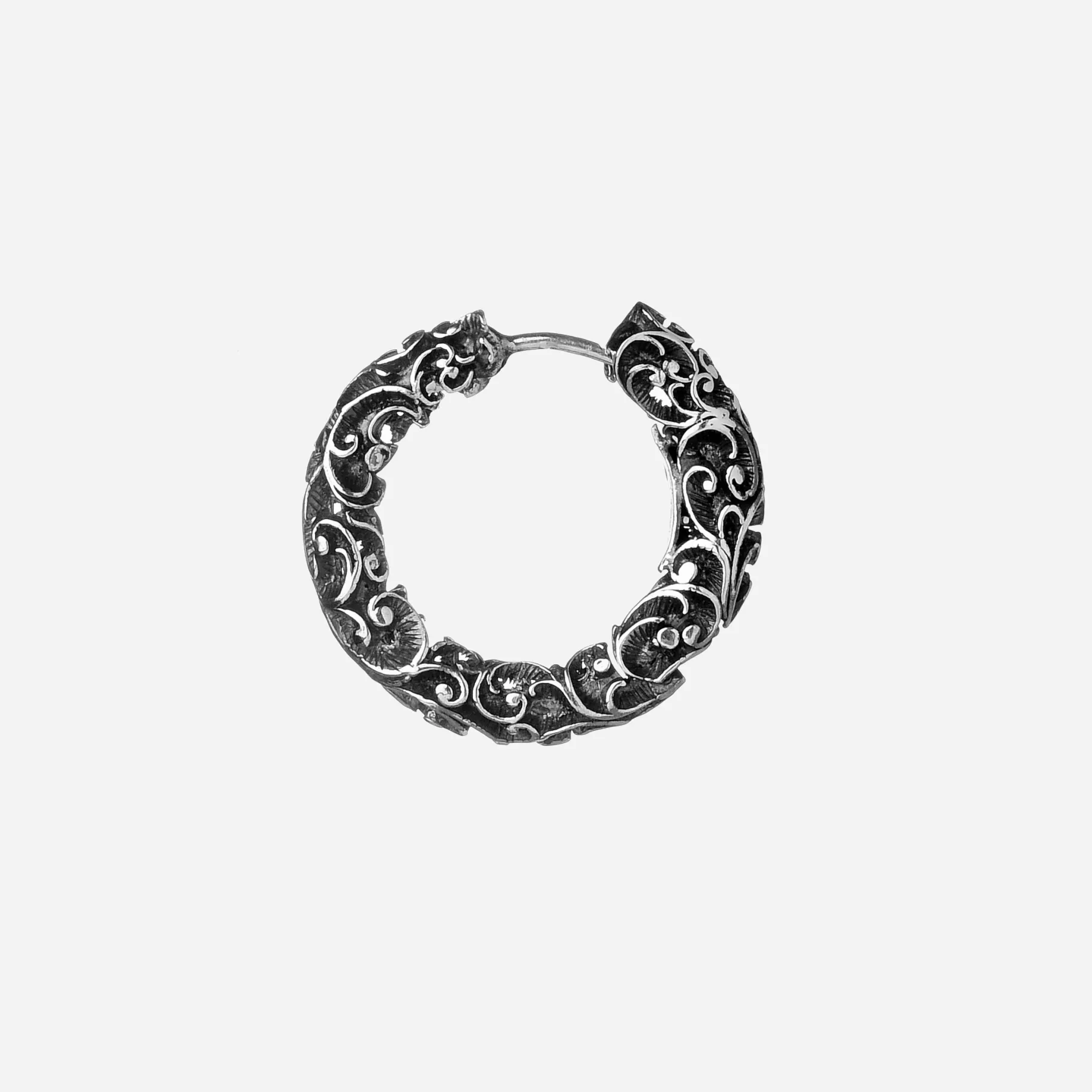 Orecchini tondi con chiusura a scattino in argento brunito, perfetti da indossare nella vita di tutti i giorni, danno risalto anche agli outfit più semplici.