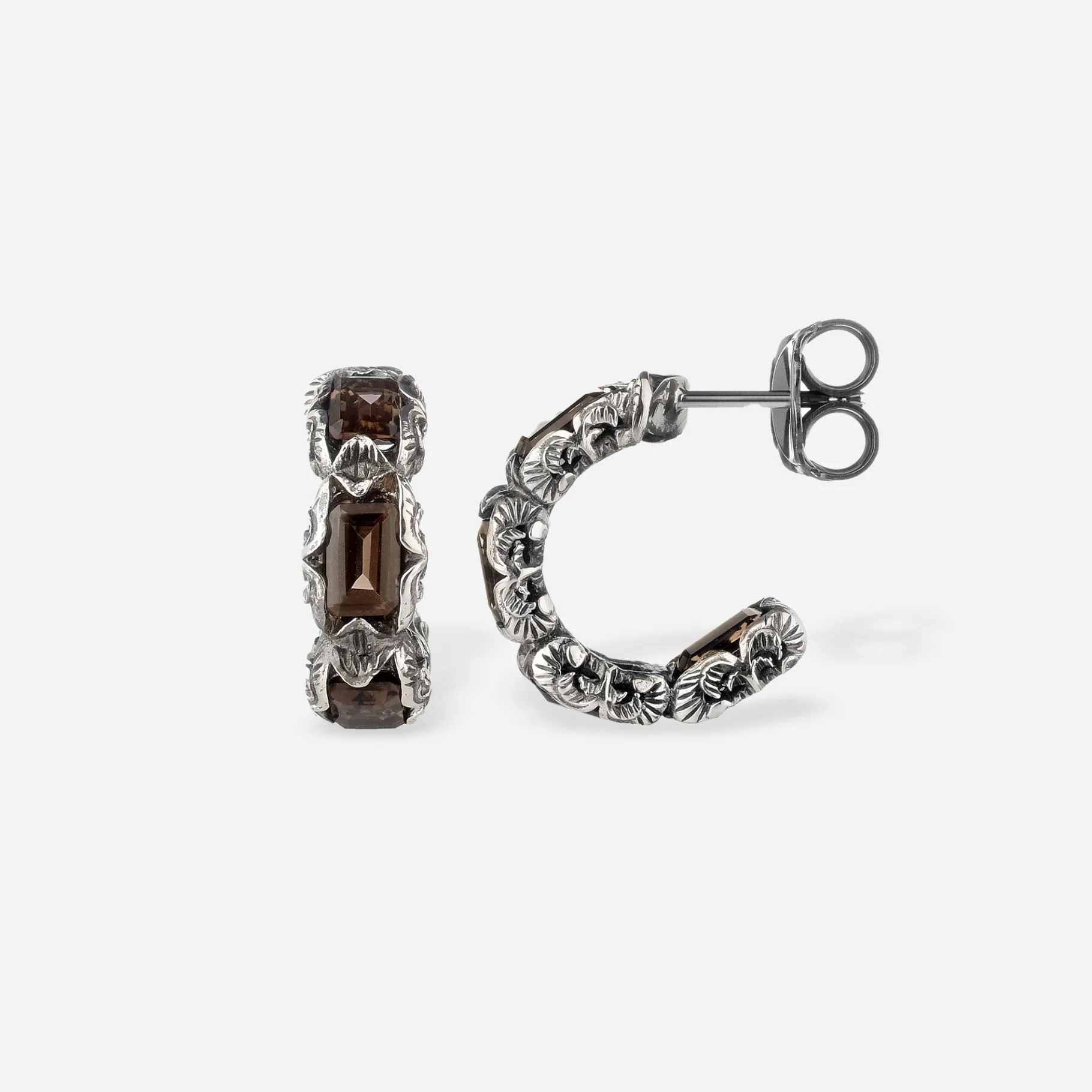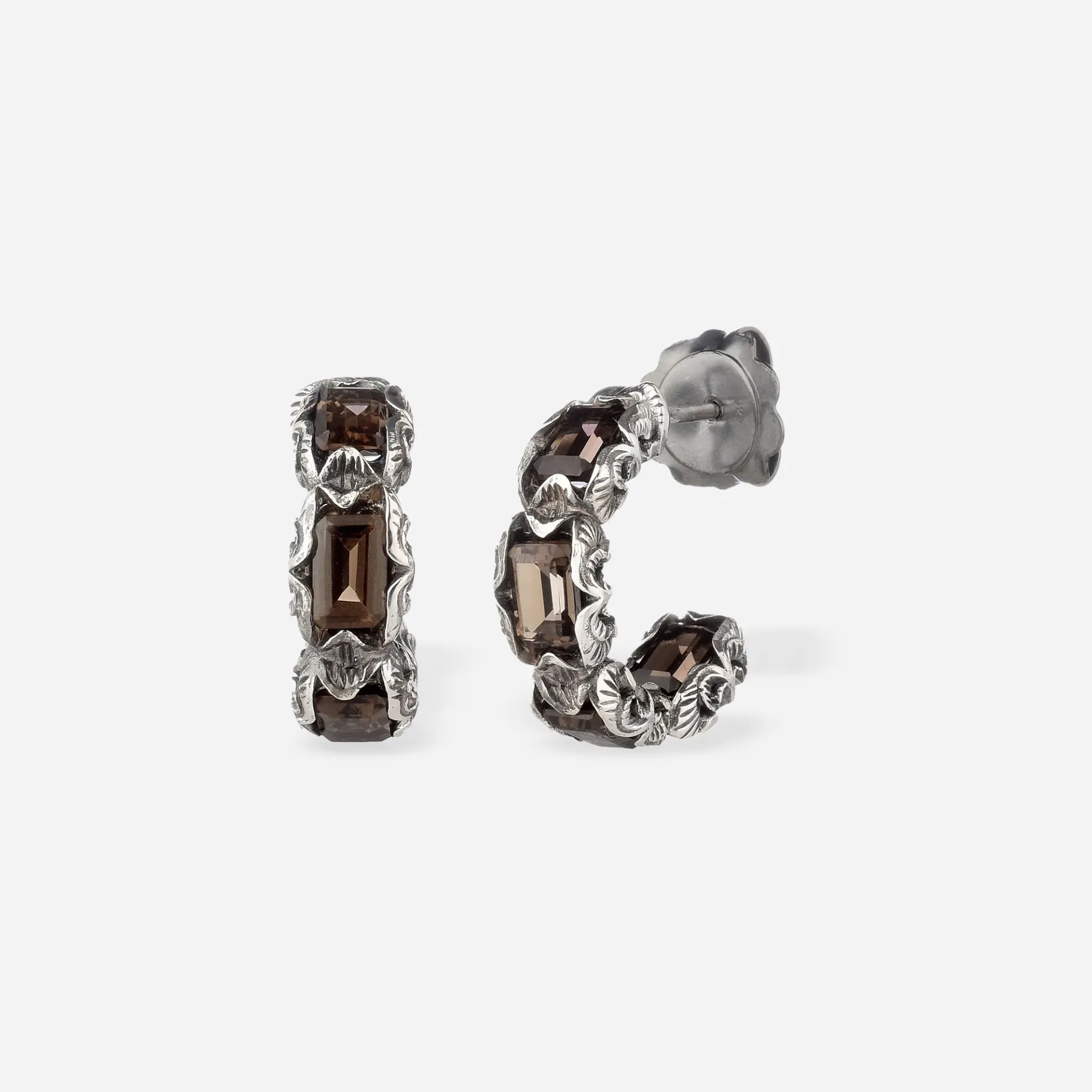 L’orecchino a cerchio della collezione Eternity si impreziosisce di 4 pietre naturali in Quarzo Fumé dal taglio smerald…